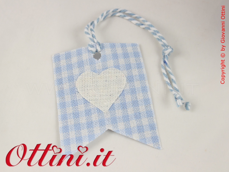 Bandierina a forma di coccarda realizzata in tessuto a quadretti celeste con trattamento antisfilo che la rende rigida e senza sfilacciature sui bordi. Al centro è applicato un cuoricino dello stesso tessuto. Un cordoncino bicolore (Bianco e azzurro) completa il tutto. Può essere applicata a barattoli, vasetti, sacchettini. Un elemento decorativo appagante e di notevole impatto.