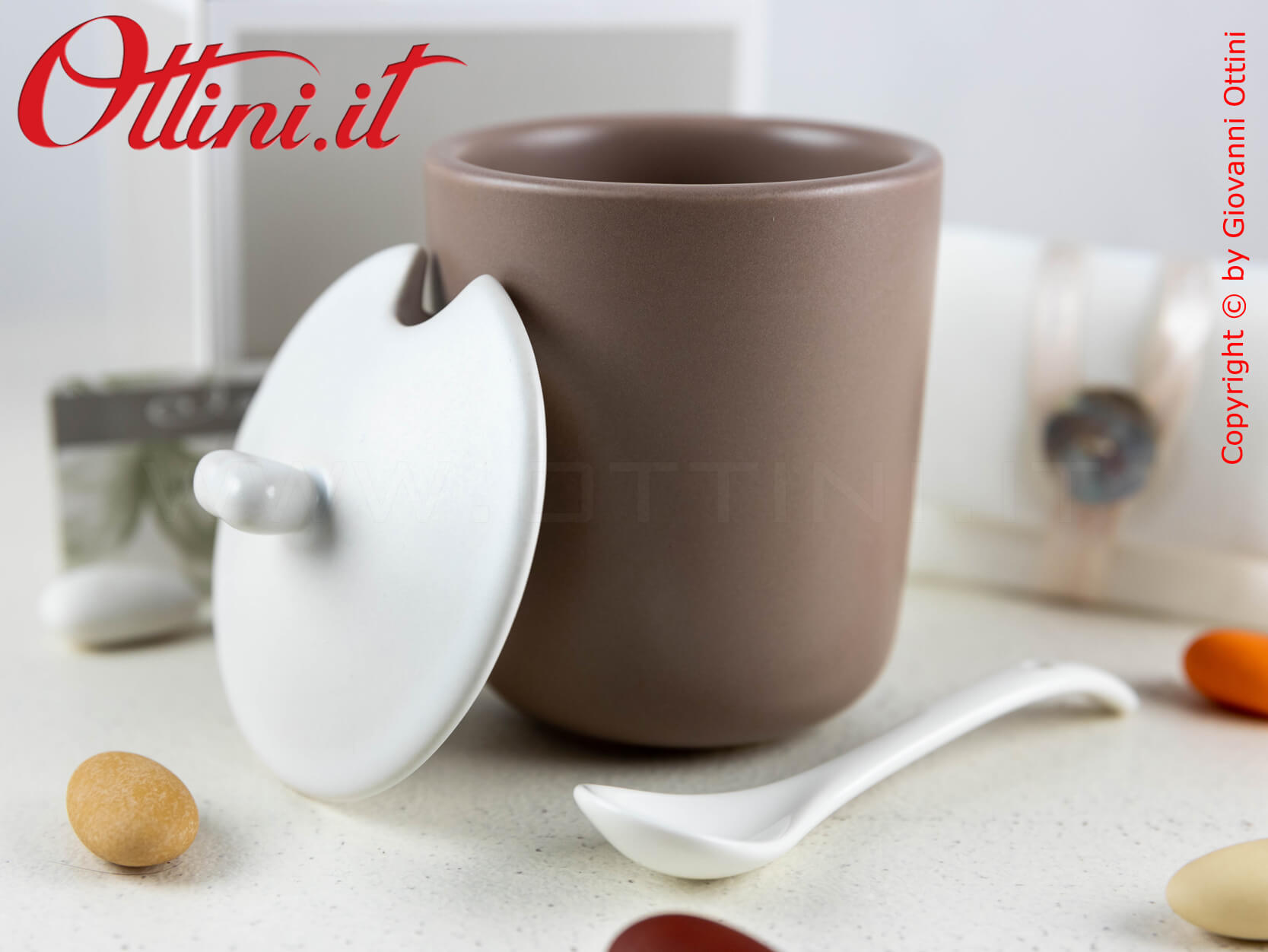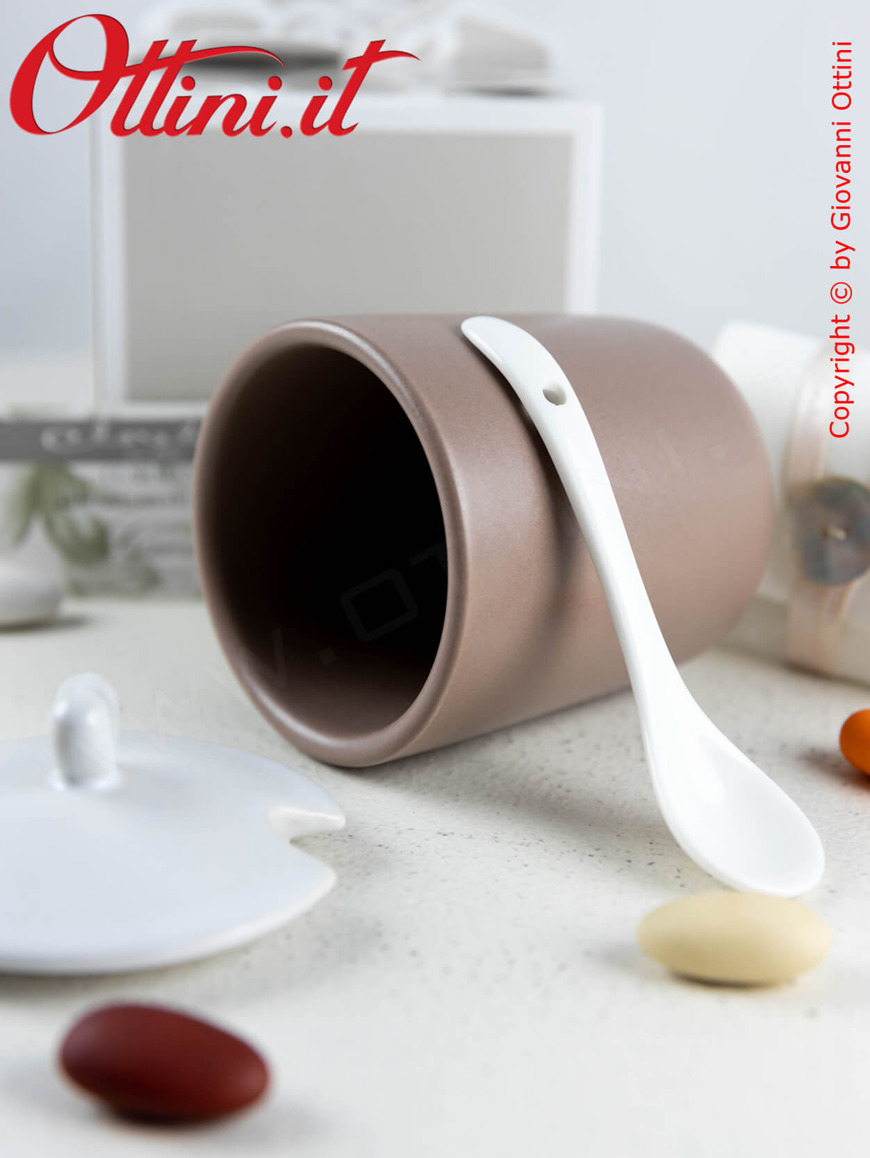Zuccheriera in tinta biscotto di finissima porcellana smaltata completa di coperchio e cucchiaino bianco smaltato.
