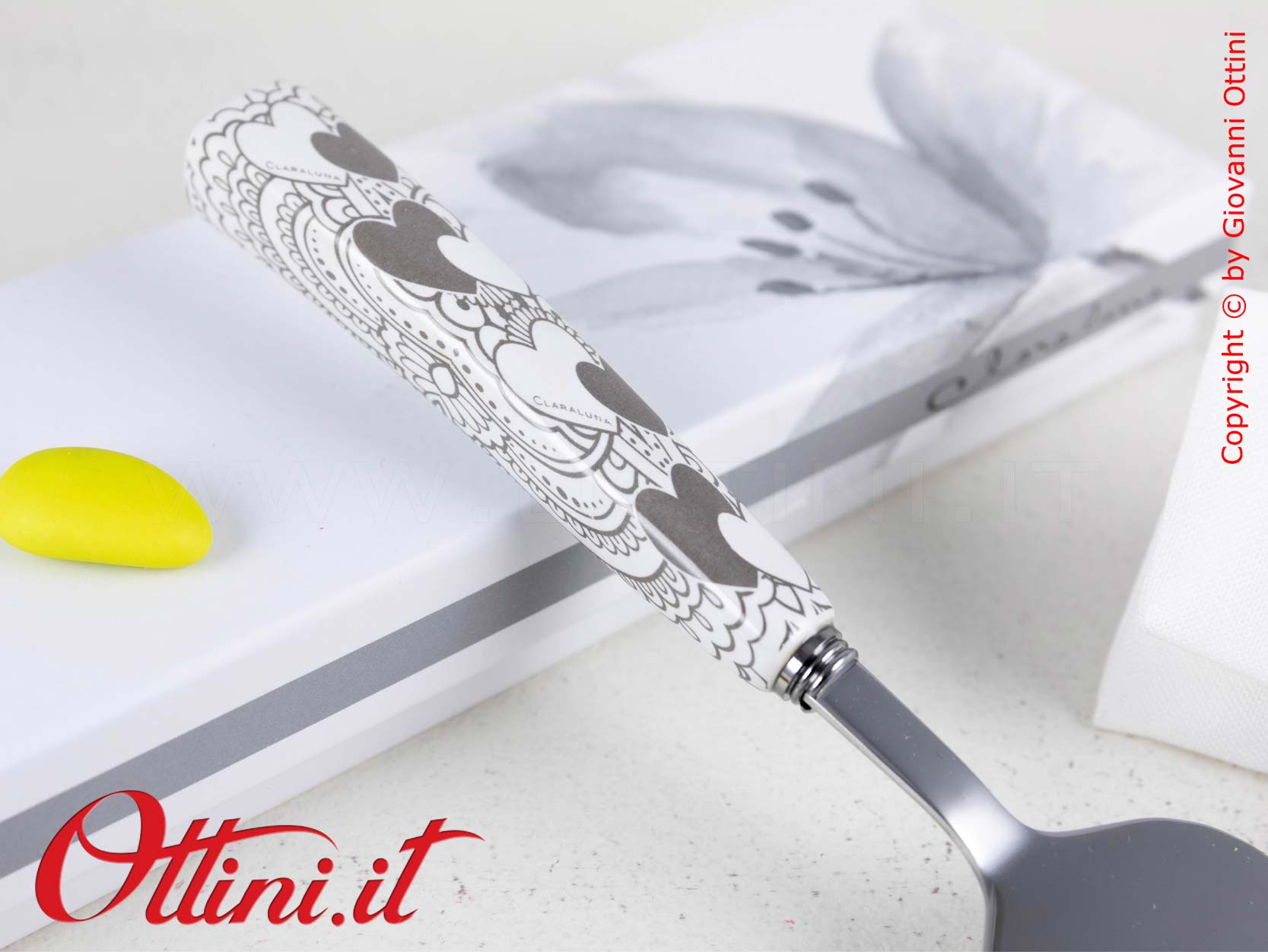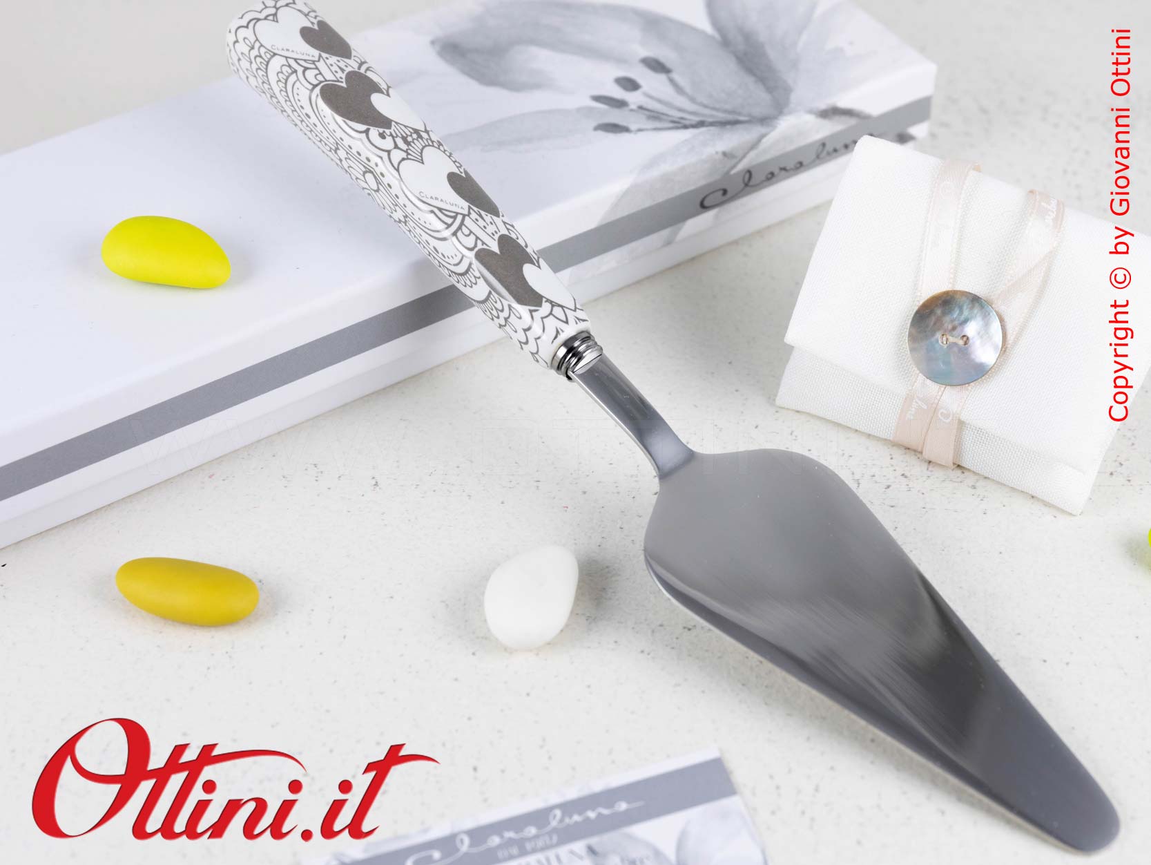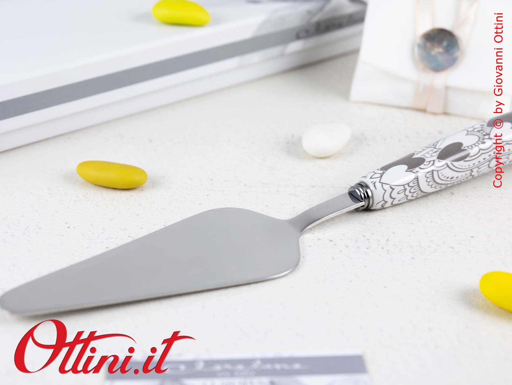 Paletta Torta realizzata in resistente acciaio con manico in resina decorata con cuoricini bicolore. Un regalo/bomboniera di tendenza che sarà molto apprezzato da chi preferisce ricevere bomboniere utili al posto dei soprammobili.