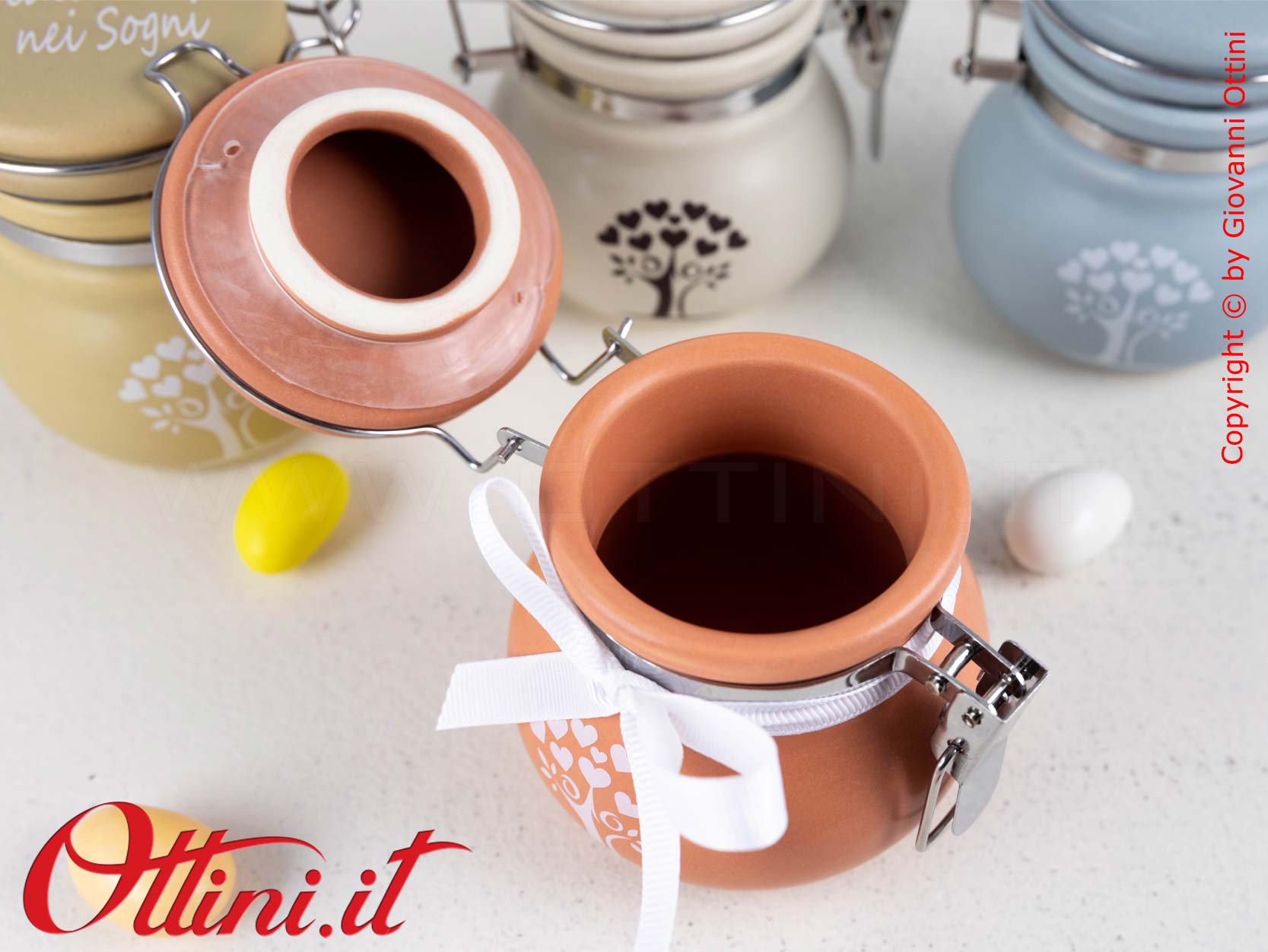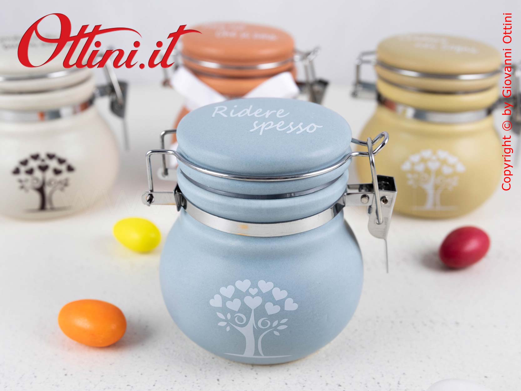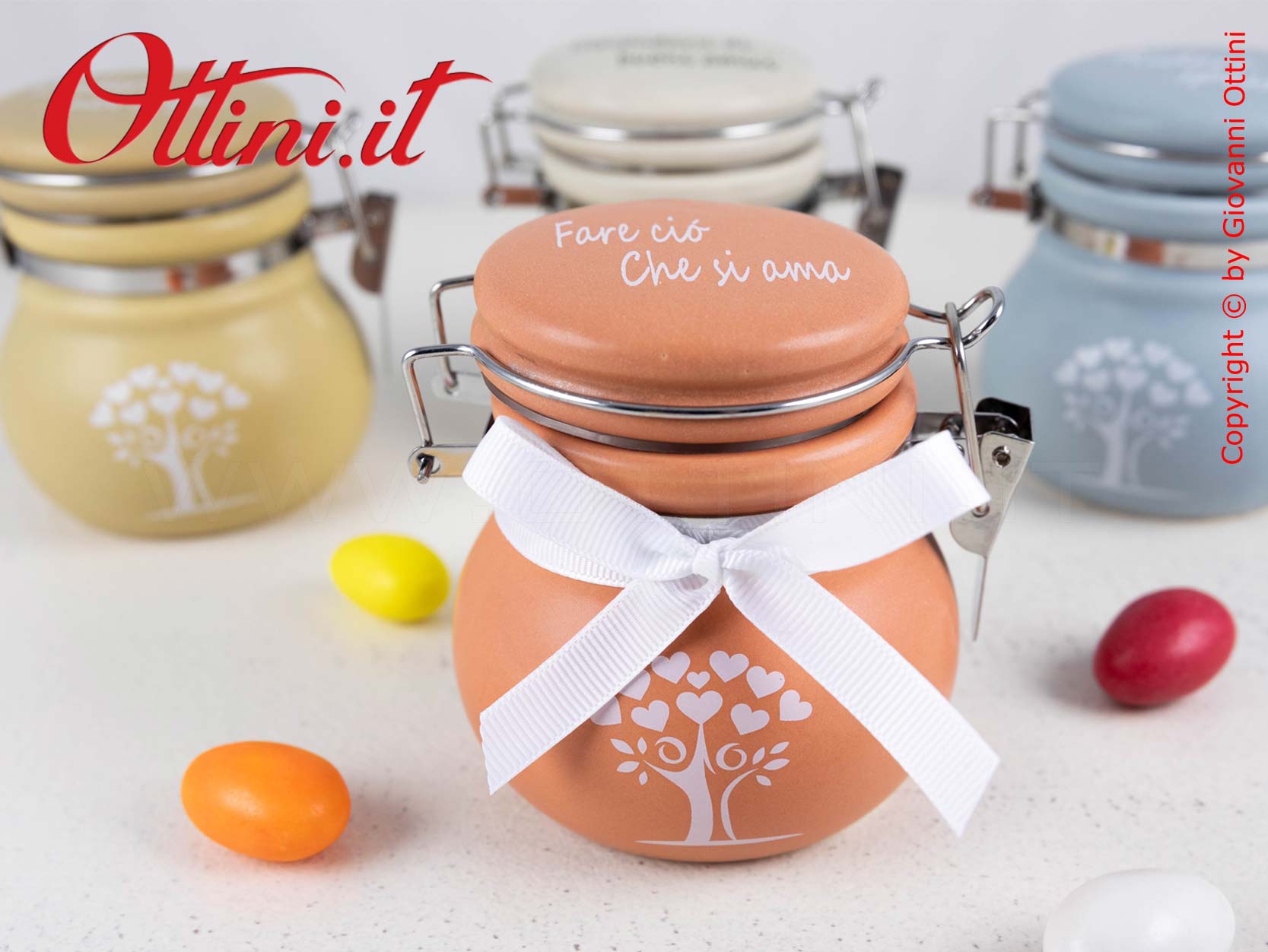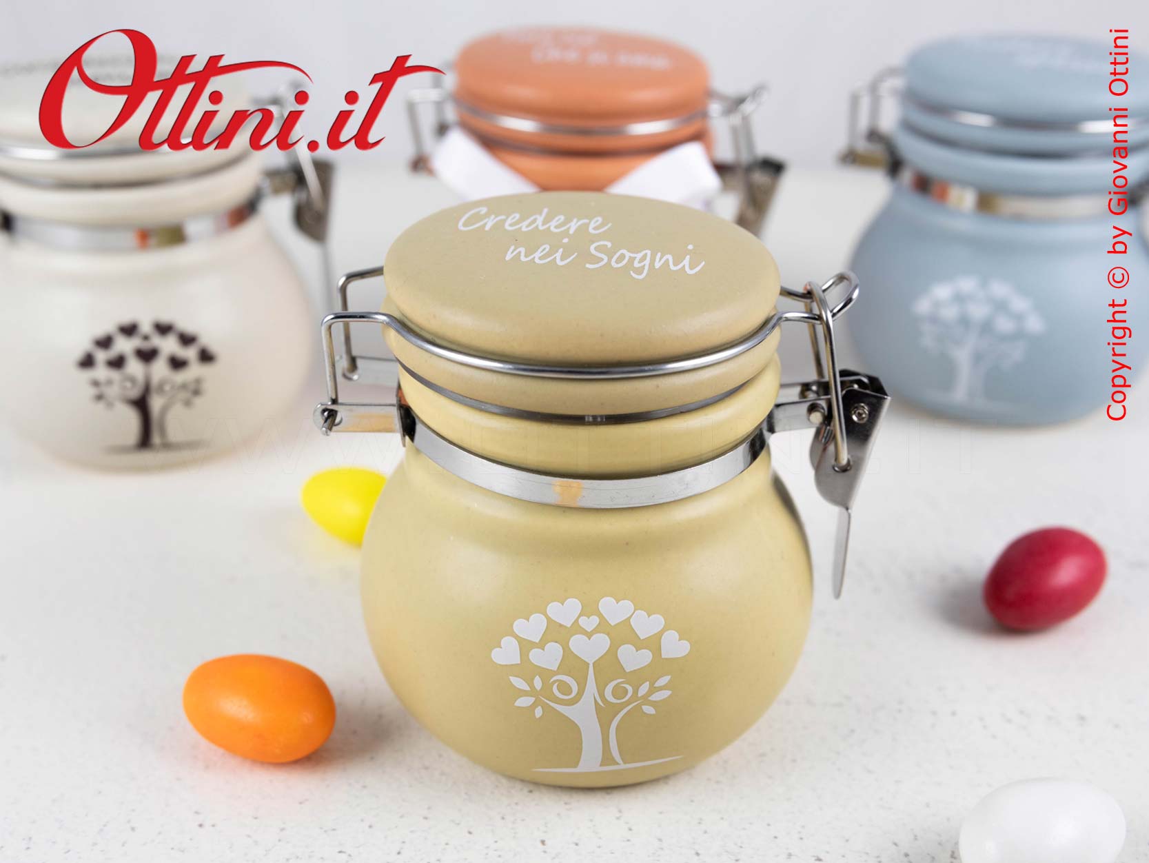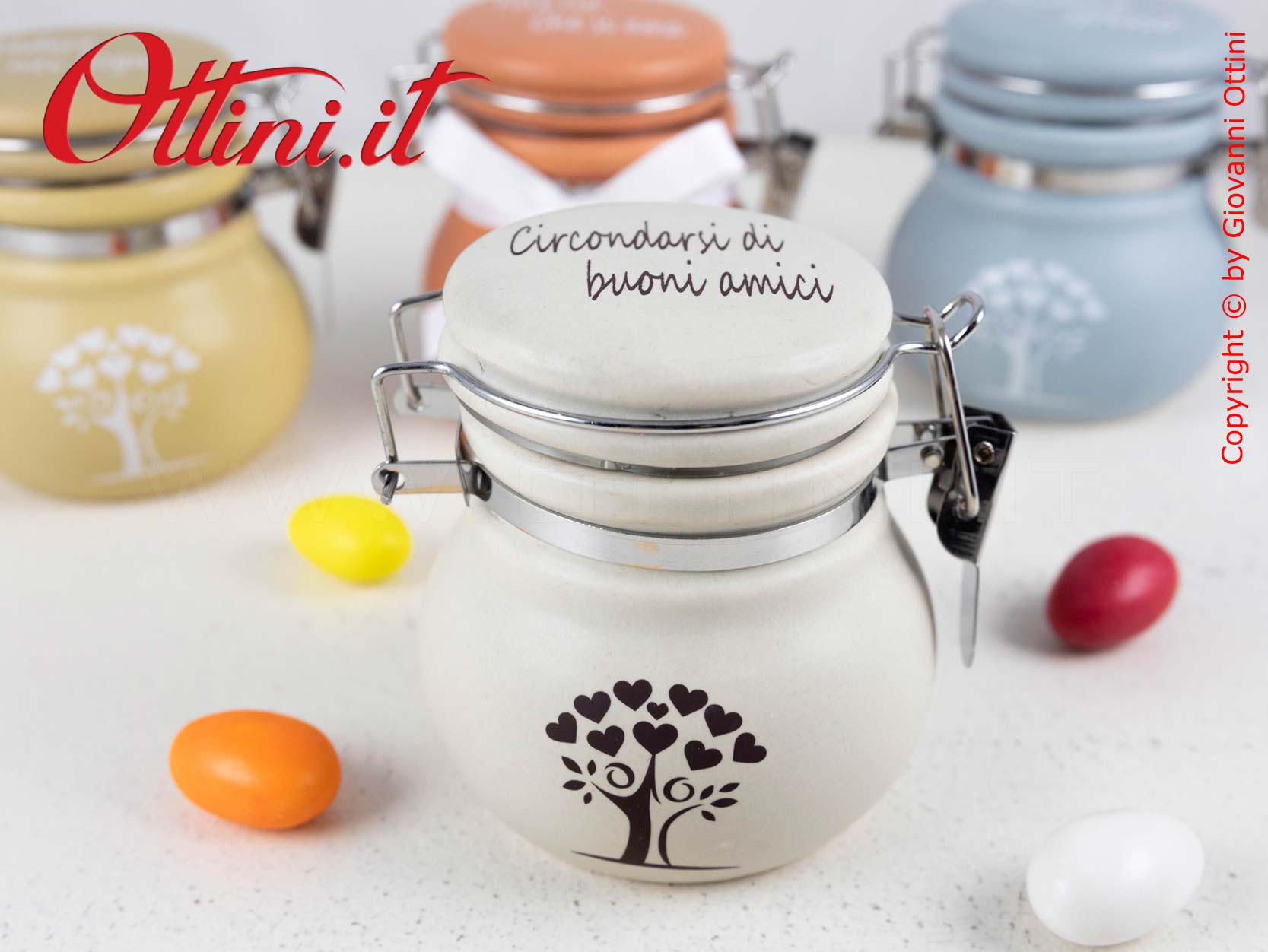 Meraviglioso Barattolo grande in ceramica colorata con albero della vita formato da una coppia stilizzata. Aspetto vintage di sicuro impatto estetico, già collaudato con successo negli anni precedenti con grafiche differenti. Il coperchio è con chiusura ermetica. All’interno ci stanno tutti i tipi di confetti che volete e successivamente potranno essere utilizzati come portaspezie, zuccheriera, ecc…