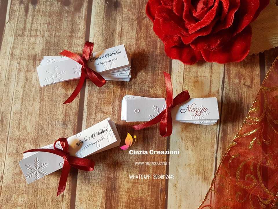 Bigliettini bomboniera fiocco di neve in rilievo, nomi degli sposi e data del matrimonio stampati, per decorare la vostra bomboniera.