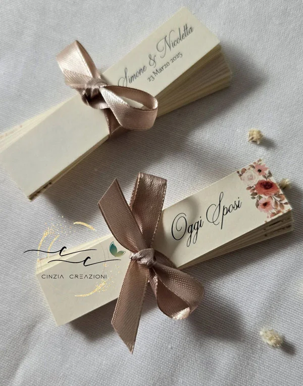Bigliettini bomboniera matrimonio tema fiori con stampa a tema e scritta “nozze” sul fronte, nomi sposi e data all’ interno.
