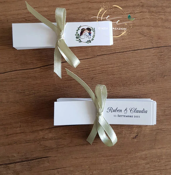 Bigliettino bomboniera sposini iniziali stampate sul fronte con ghirlanda, nomi sposi e data all’interno.