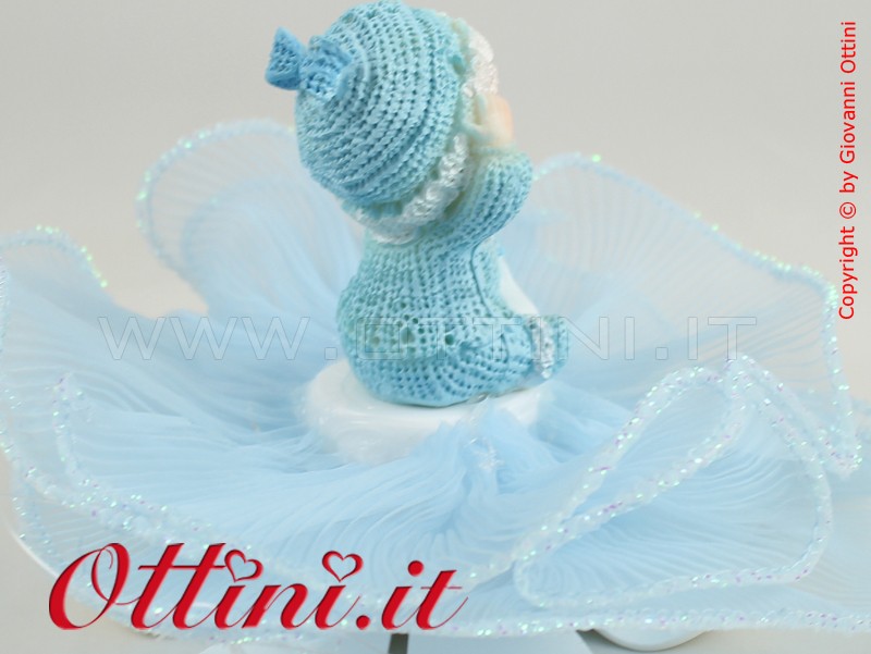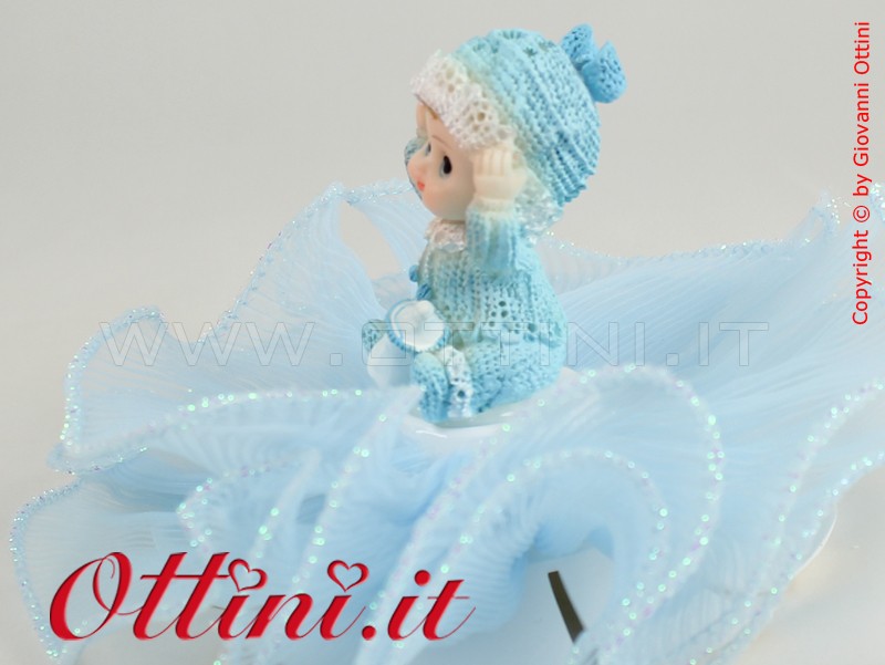 Soffici voulant e tanta tenerezza in questo fantastico prodotto. Il Bimbo è realizzato in resina finemente colorata. La composizione è realizzata su un supporto plastico per alimenti con base a “fiore”, molto stabile e totalmente rivestita di tessuti in organza plissettata e finiture glitterate.