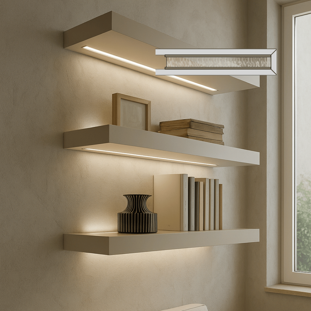 Il profilo led DS9030 si presenta come una mensola prefinita rinforzata con MDF e nido d’ape. Questa mensola led rinforzata è perfetta per creare sostegni e ripiani per scarpiere, librerie e vetrinette. Immaginiamo anche quanto sia comodo poter utilizzare dei ripiani in grado di illuminarsi e migliorare non solo la luminosità ma anche l’effetto estetico degli interni, conferendo agli ambienti un tocco di modernità ed originalità.