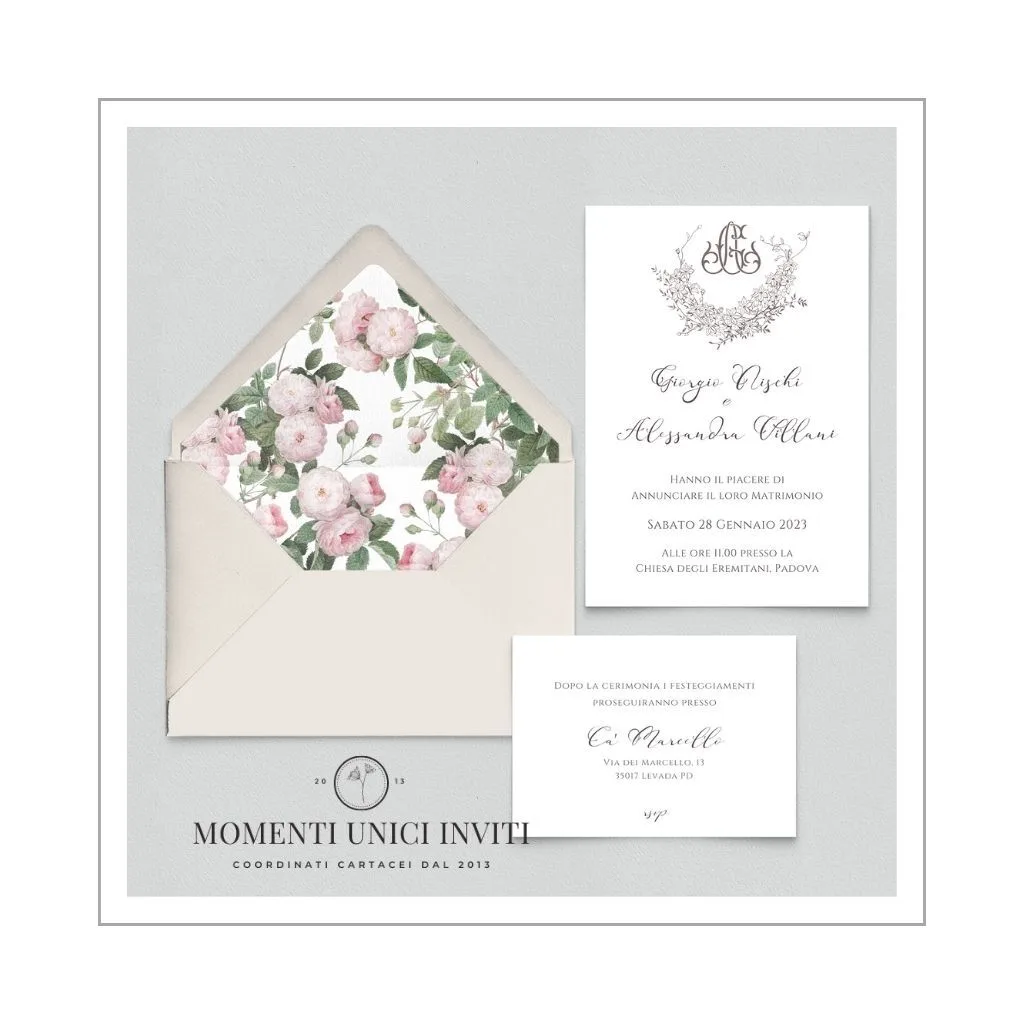 Elegante partecipazione e card invito al ricevimento compresa di busta tintoretto gesso da 140 g. e liner stampato (fodera interna alla busta) realizzato con la stessa tipologia di carta di partecipazione e invito al ricevimento. Possibilità di scegliere la busta colorata opaca.