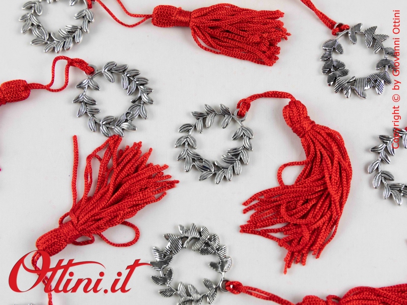 Elegantissimo decoro alloro per laurea realizzato in zama argentata. Completo di cordoncino con nappa rosso, è ideale per la decorazione di barattoli, vasetti e sacchettini. La tradizione del tocco è tipica delle università americane, mentre in Italia la corona di alloro è più rappresentativa. Ciò nonostante quasi tutti i produttori puntano ancora sul tocco quale simbolo principale. Il nostro fornitore ci propone sia questa questa versione nostrana, che quella con il tocco e la corona di alloro