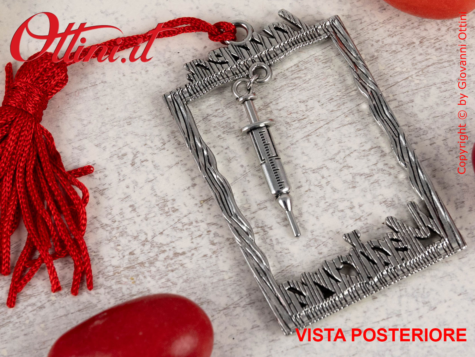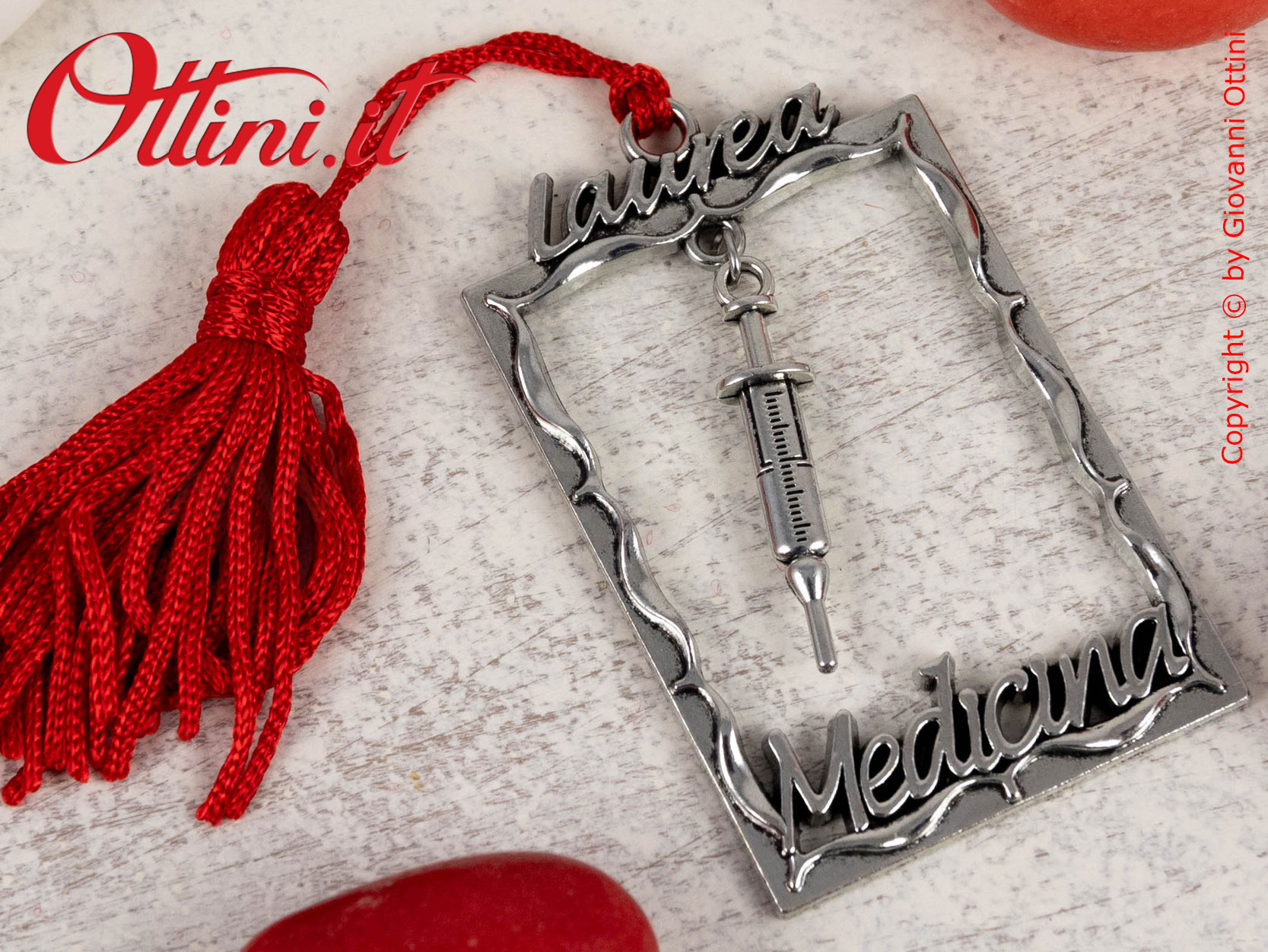 Elegantissimo decoro per laurea in Medicina realizzato in zama argentata. E’ composto da una cornice in cui sono ricavate le scritte e un pendaglio centrale con il simbolo della facoltà. Completo di cordoncino con nappa rossa che conferisce un aspetto molto gradevole e di qualità, è ideale per la decorazione di barattoli, vasetti e sacchettini. Sulla parte superiore è ricavato un anellino che permetterà di essere applicato al vostro portachiavi.