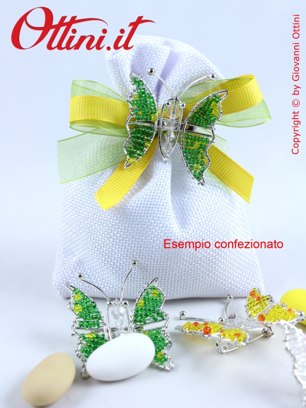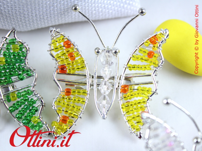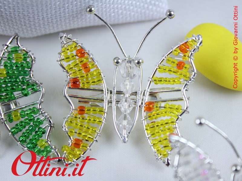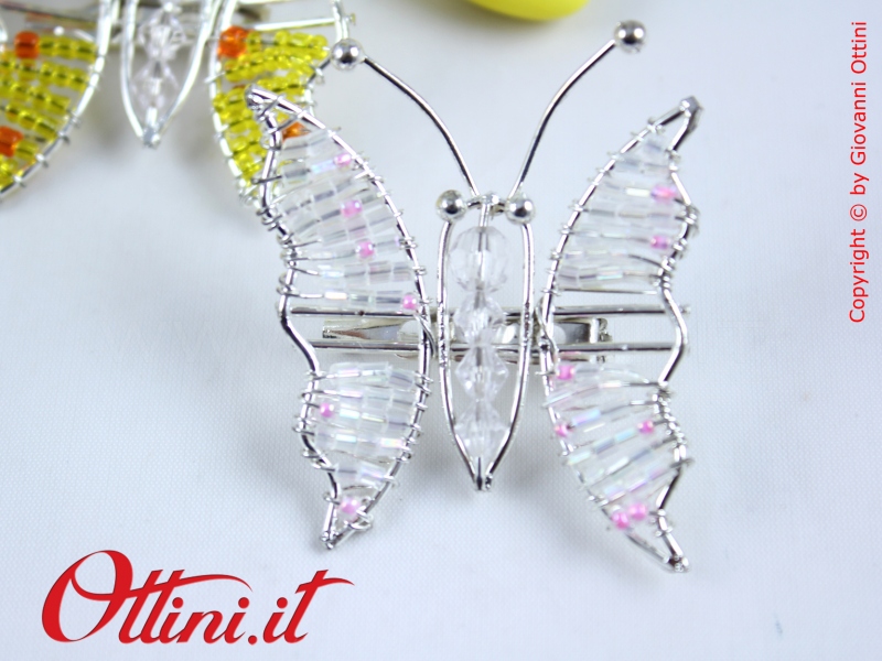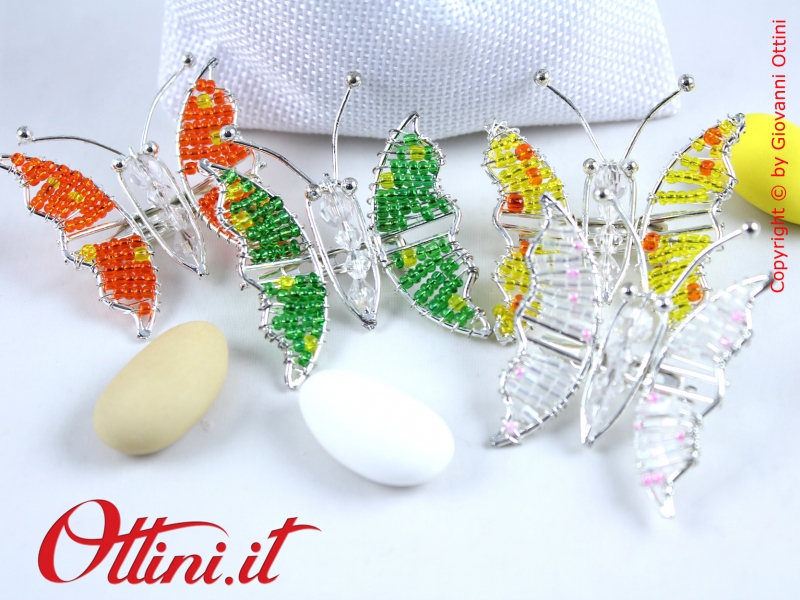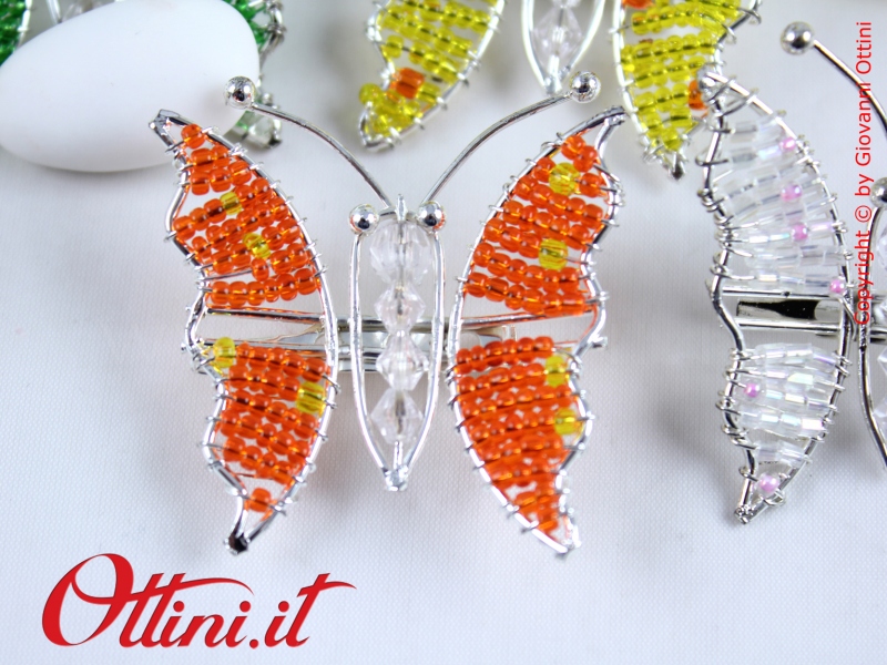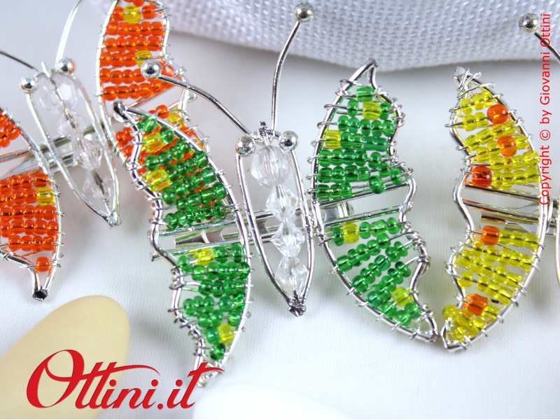 Coloratissime farfalle realizzate in metallo con perline dai colori vivacissimi. Sul retro è presente la spilla, utile per essere agevolmente collocata sulle vostre creazioni in tessuto.