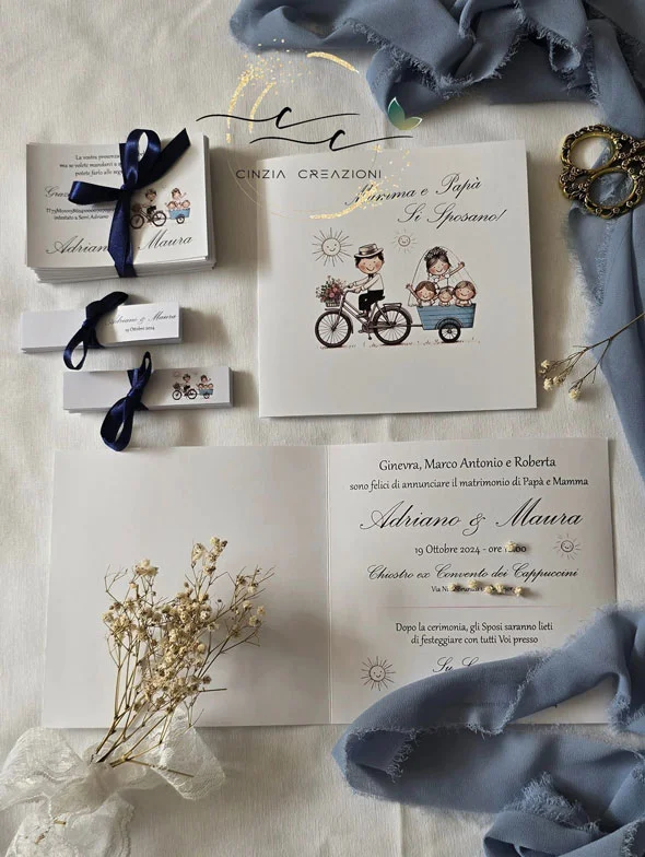 Bigliettini bomboniera matrimonio collezione Felicità, con sposini simpatici e bimbi sul carretto stampati all’esterno, nomi e data delle nozze stampati all’interno.