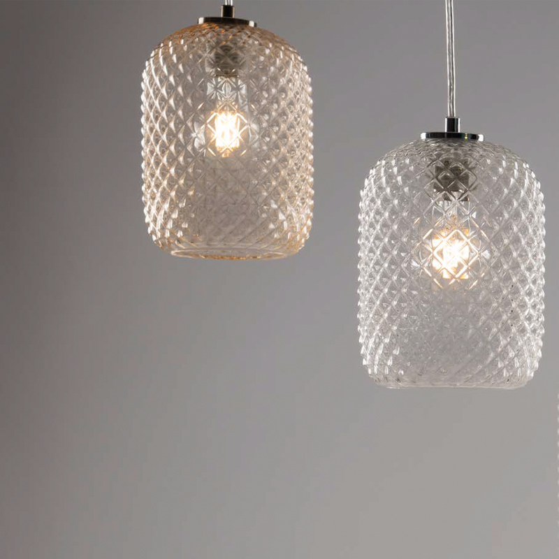 - Collezione in vetro cristallo sfaccettato nei colori ambra, trasparente, fumè, acquamare e bianco satinato.