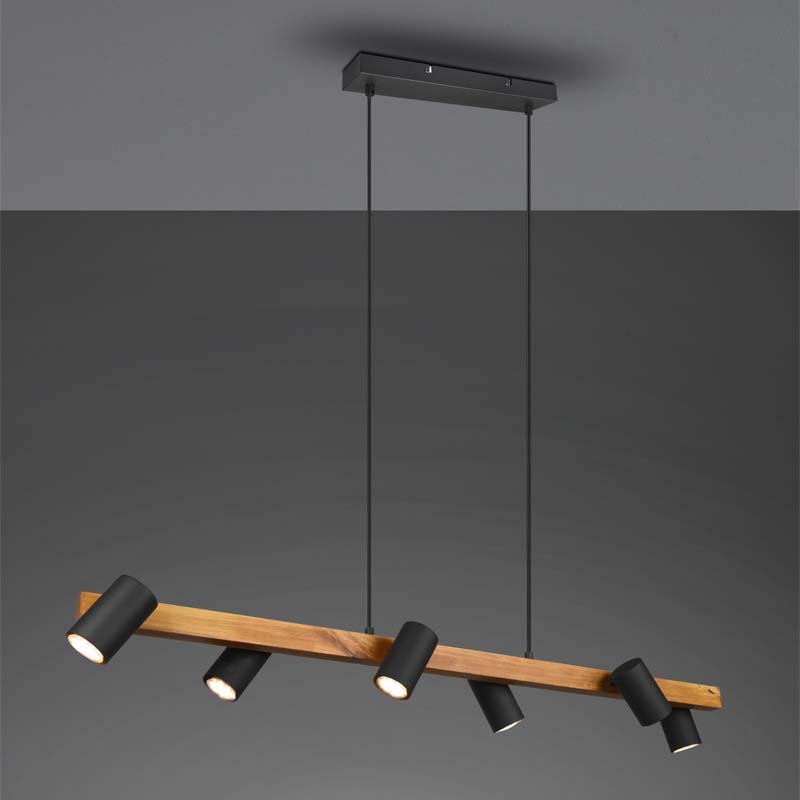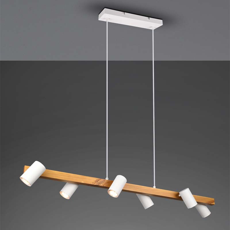 Lampadario moderno Marley, barra in legno e 6 faretti led cilindrici orientabili