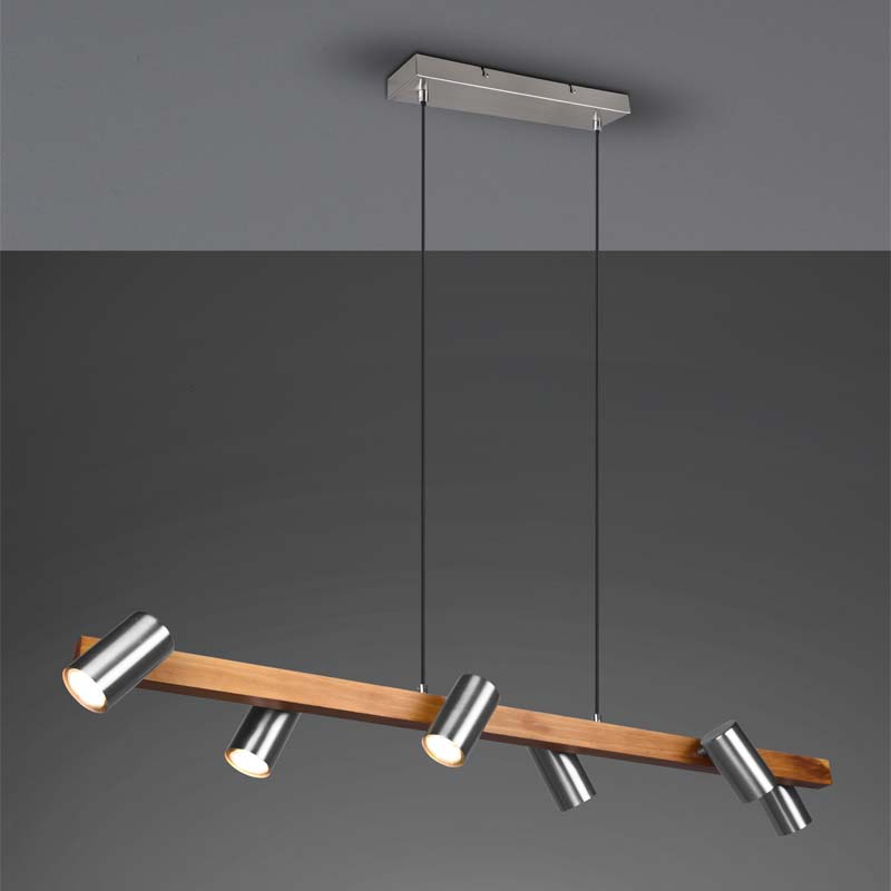 Il lampadario led va pertanto a creare una suggestiva combinazione tra il calore del legno e l’eleganza moderna del metallo. I faretti cilindrici sono orientabili, consentendoci di direzionare il fascio luminoso esattamente dove serve.