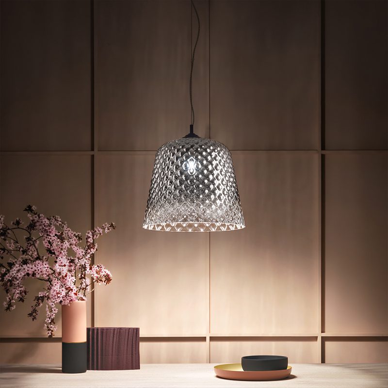 Dal rosone partono più fili che possono poi essere decentrati, posizionati in maniera asimmetrica o meno, a seconda di dove vogliamo posizionare il corpo luce. Il paralume in vetro è un tocco di raffinatezza curato nei minimi dettagli, che aggiunge delicatezza ed armonia agli interni, siano essi in stile contemporaneo che classico.