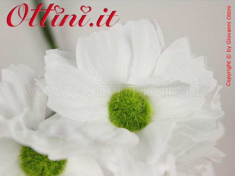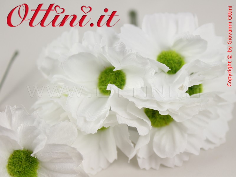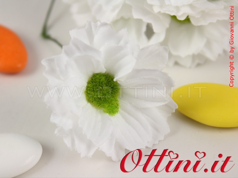 Margherita artificiale in tessuto bianco, particolarmente indicata per il confezionamento di sacchettini e bomboniere. Ha una discreta dimensione che riempie con eleganza senza necessità di aggiungere altri addobbi. La composizione ha un diametro di 4,5 cm, uno spessore di 1 cm.