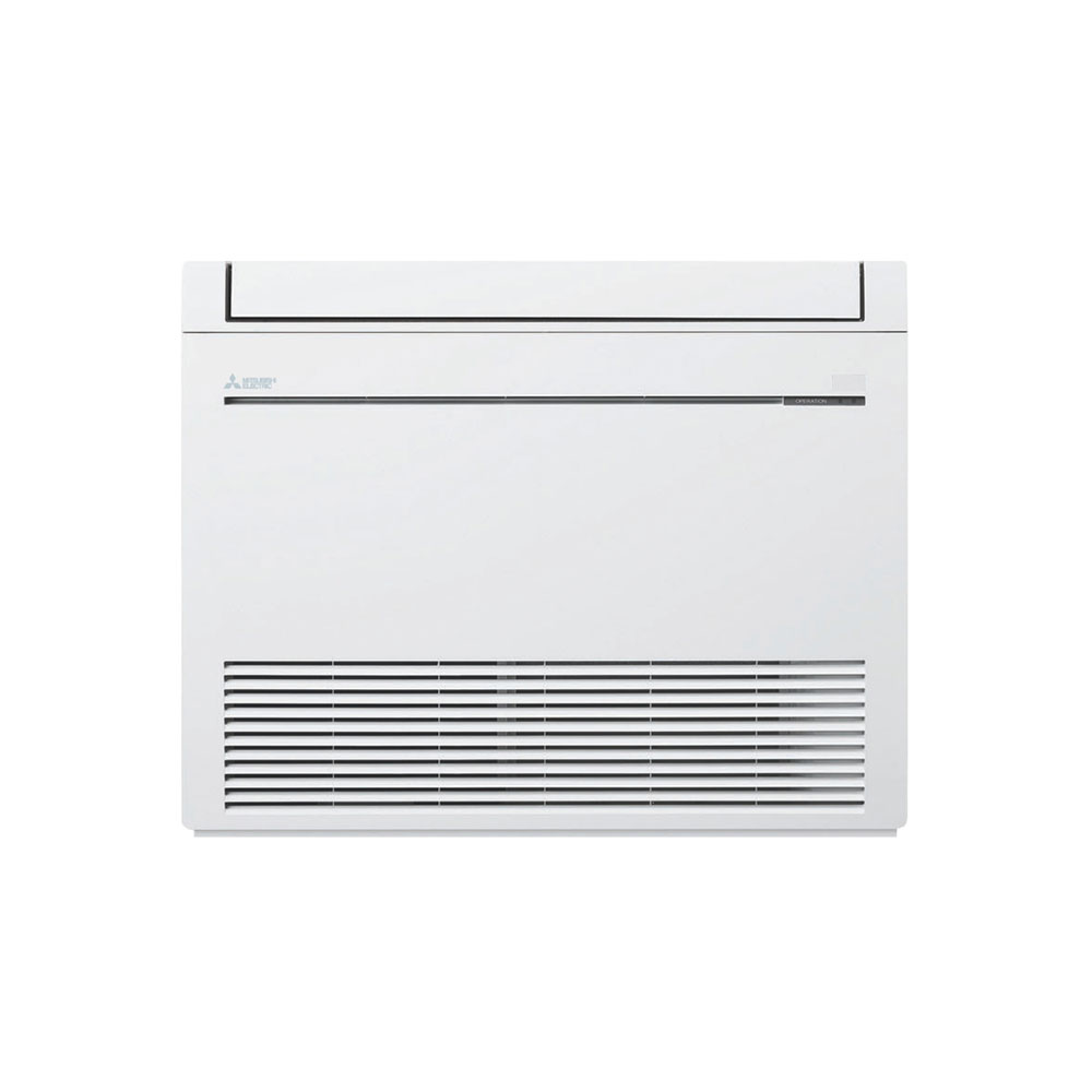 Climatizzatore Inverter a Pavimento Mitsubishi Electric Linea MFZ-KT. Il set composto da unità interna MFZ-KT35VG da 12000 btu in classe energetica A++/A+, con gas ecologico R-32, Wi-Fi Optional e unità esterna SUZ-M35VA da 3,5 kW.