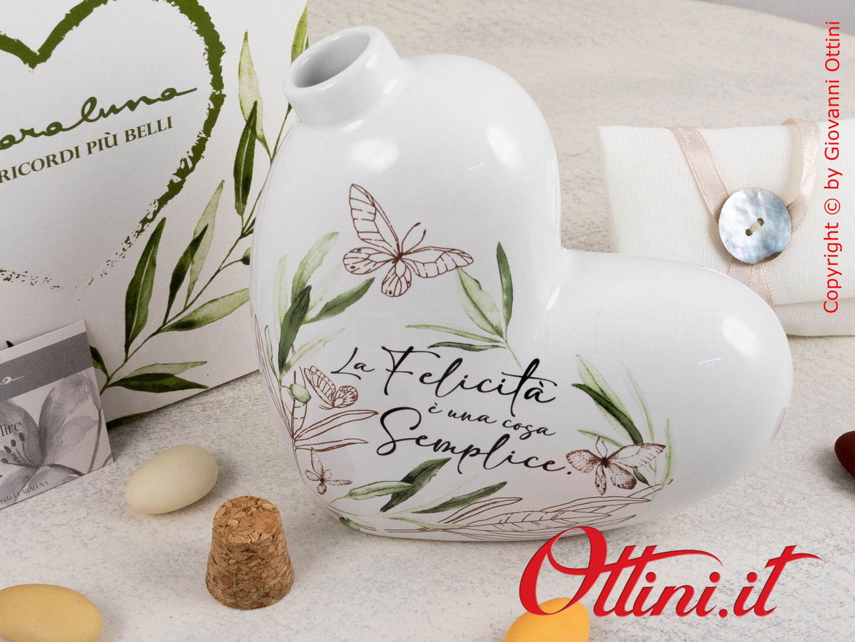 La tendenza alla regalistica utile che ha orientato le proposte dei principali produttori negli ultimi anni, è stata recepita in modo costruttivo da Claraluna che ha realizzato prodotti esclusivi e originali nel design: l’oliera grande a cuore con tappo in sughero, è un esempio riuscito di questo settore. Realizzata in porcellana bianca smaltata è valorizzata da una stampa floreale con foglie di ulivo e farfalle, sarà un complemento elegante, un valore aggiunto alla tavola dei vostri invitati. Claraluna ha puntato molto anche sul lato emozionale con frasi e aneddoti che troverete stampate sul prodotto: “La Felicità è una cosa semplice” è quella che troverete su questa oliera.