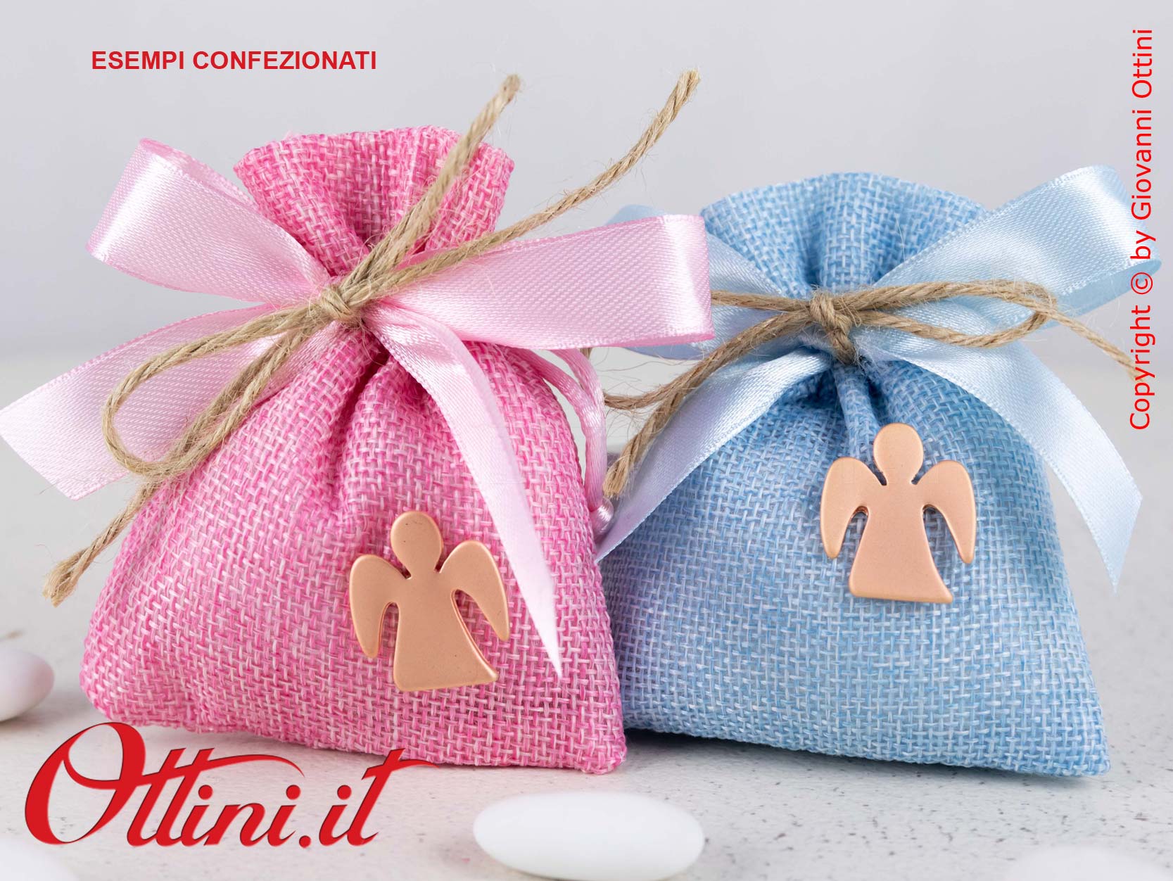 Nell’esempio che vedete nell’ultima fotografia, abbiamo abbinato il Pin Angelo Rame Satinato sui sacchettini portaconfetti che trovate in questa categoria (nello specifico il sacchettino Juta Rosa e quello Celeste), ma qualsiasi prodotto in tessuto lo valorizzerà.