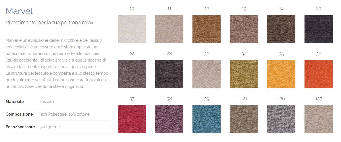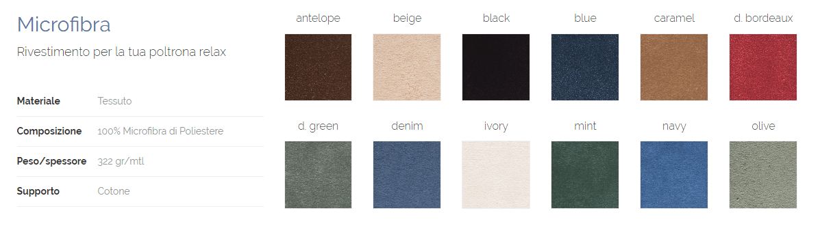 - Rivestimento: Pelle, ecopelle, microfibra e tessuto.