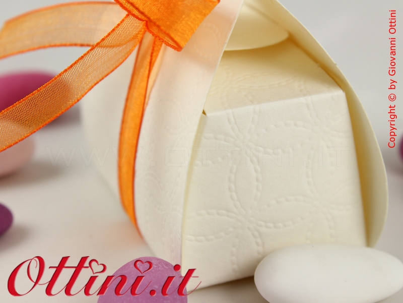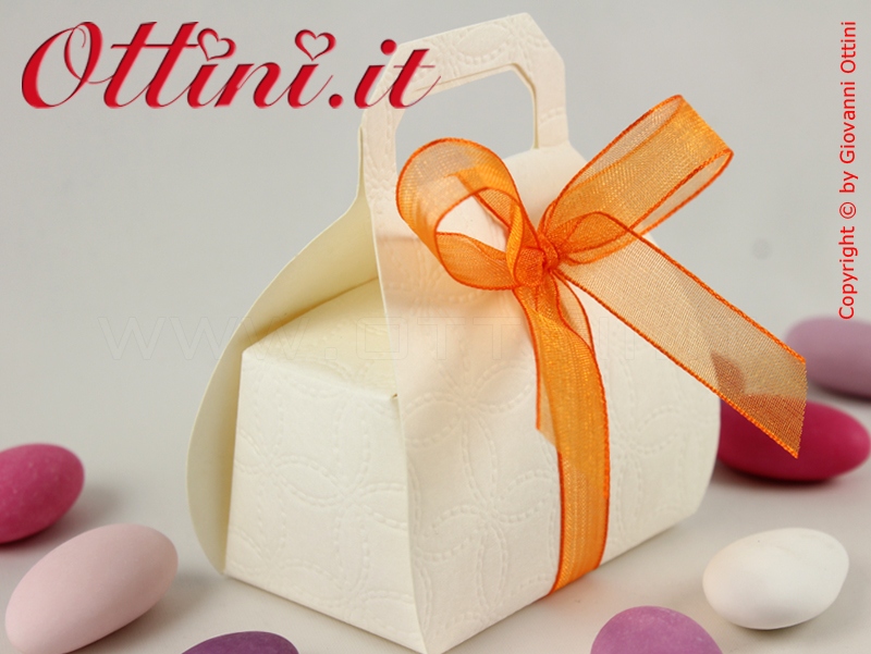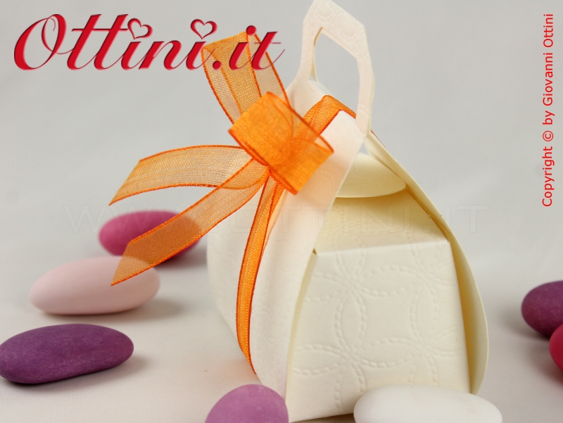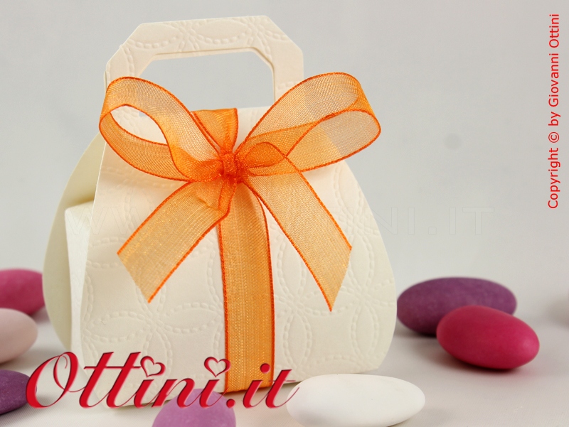 Scatolina porta confetti a forma di borsina realizzata in cartoncino bianco qualità extra. La superficie esterna è lavorata con un bellissimo e raffinato decoro a rilievo matelassé. Il montaggio è semplicissimo e veloce, non richiede uso di colle e nastri. Al suo interno ci stanno 5 confetti di ogni tipo, compresi i cioccolato e mandorla insieme che sono i più grandi in commercio.
