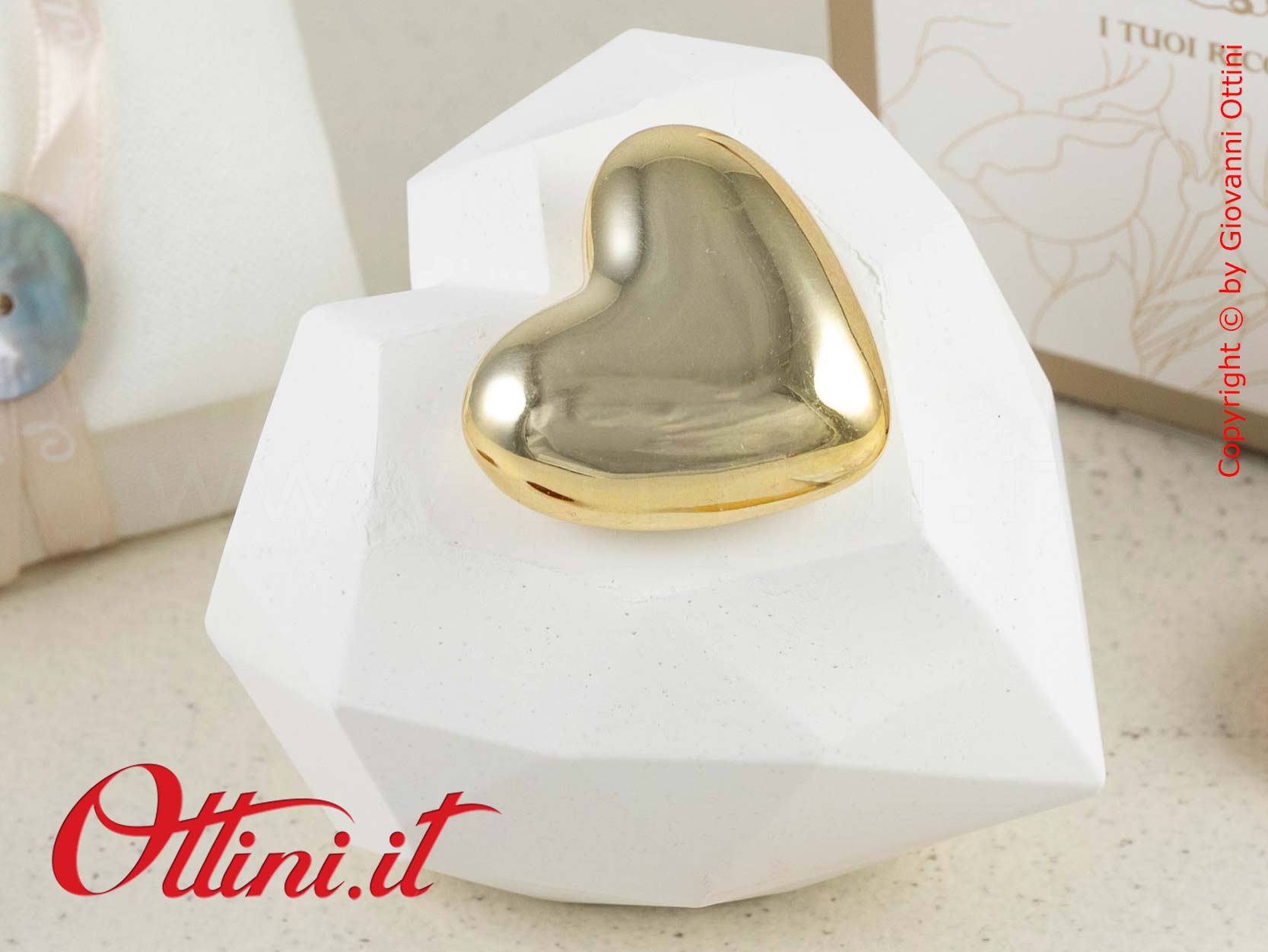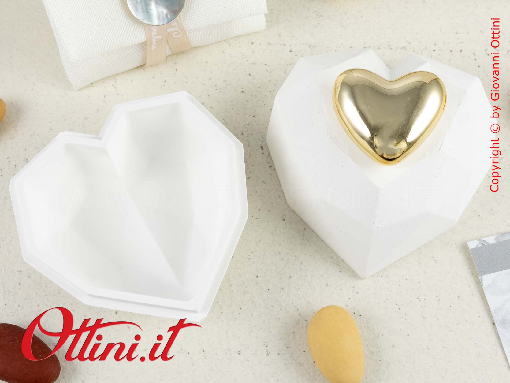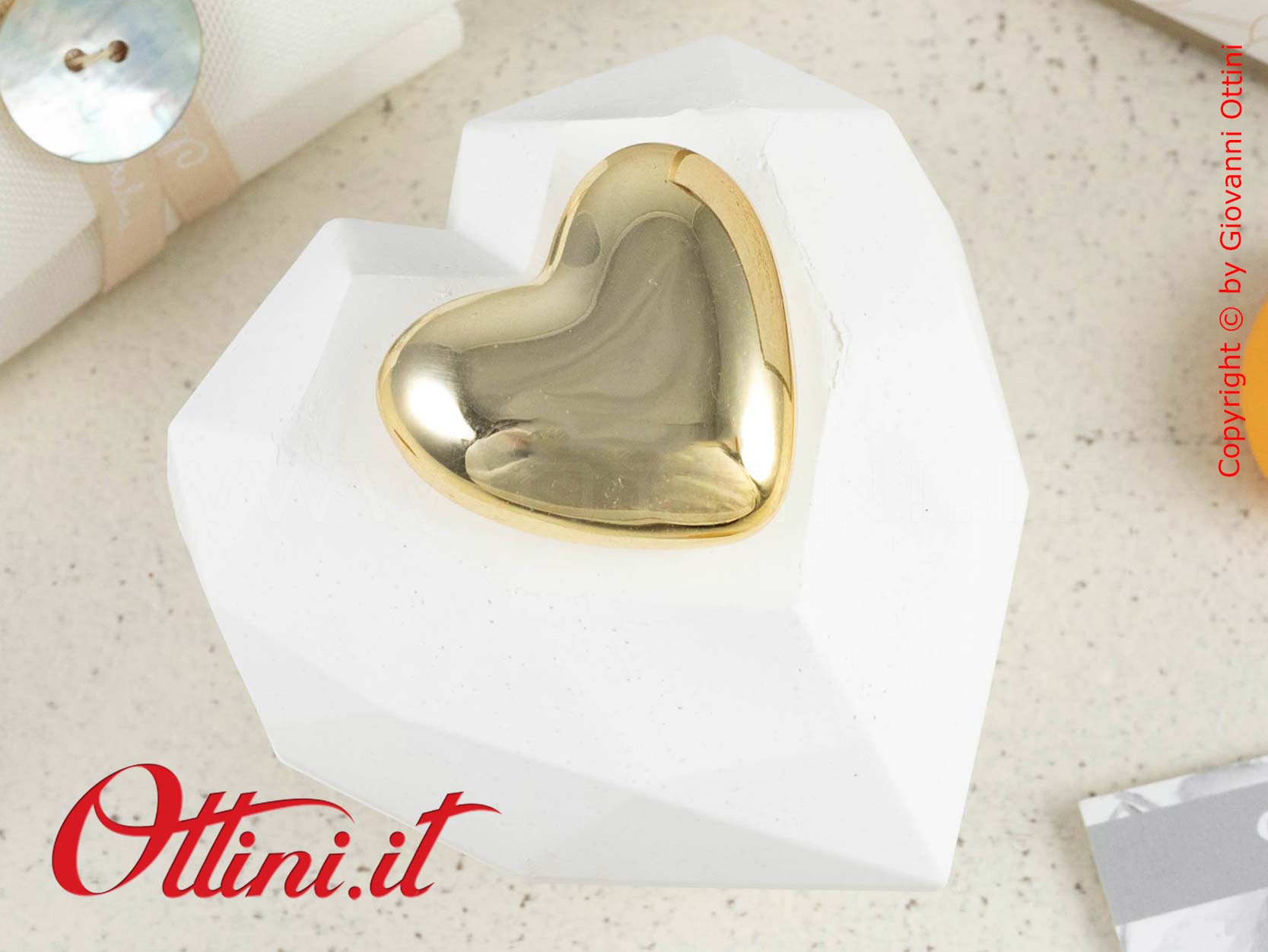 Romanticissima scatolina a forma di cuore, realizzata in gesso, con coperchio e cuore color oro. Il formato è di cm 7,5×7,5×6,8 di altezza. Le sfaccettature della finitura esterna conferiscono al design una linea moderna e romantica insieme. Sarà un bellissimo portagioie per la bigiotteria o uno svuotatasche in cui riporre i vostri piccoli oggetti.