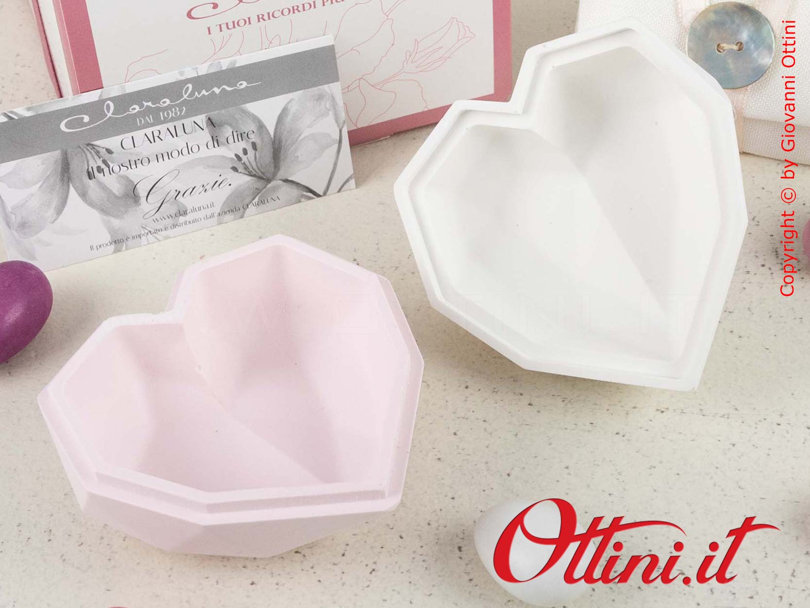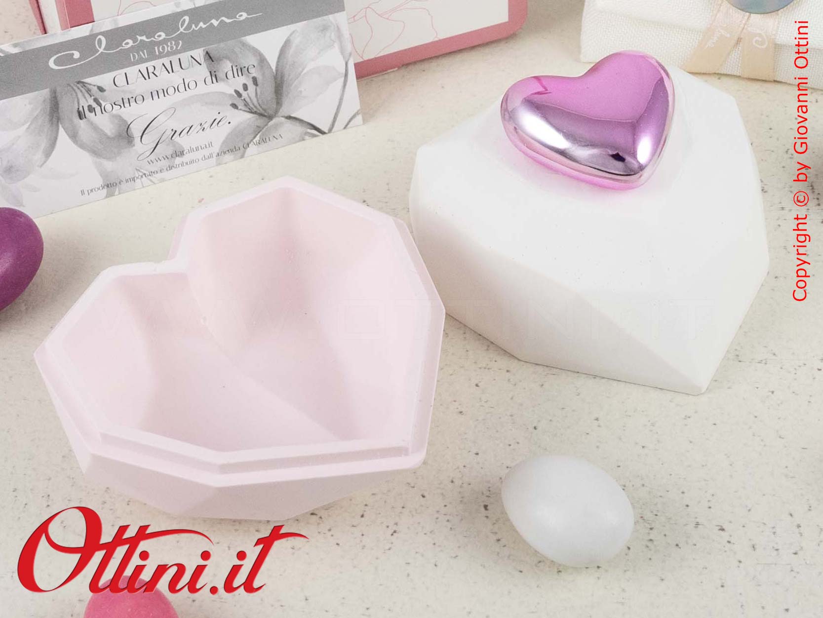 Romanticissima scatolina a forma di cuore realizzata in gesso color rosa e coperchio bianco. Su quest’ultimo Claraluna ha impreziosito il prodotto con un meraviglioso cuore rosa con finitura metallizzata a specchio. Il formato è di cm 7,5×7,5 e 6,8 di altezza totale. Le sfaccettature della finitura esterna conferiscono al design una linea moderna che ben si adatta a qualsiasi tipo di arredo. Sarà un bellissimo portagioie per la bigiotteria o uno svuotatasche in cui riporre i vostri piccoli oggetti.