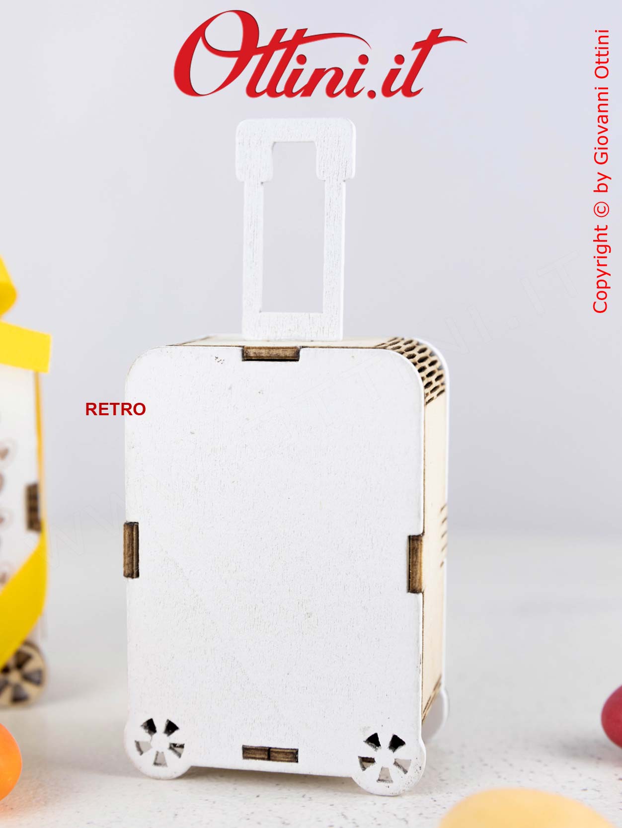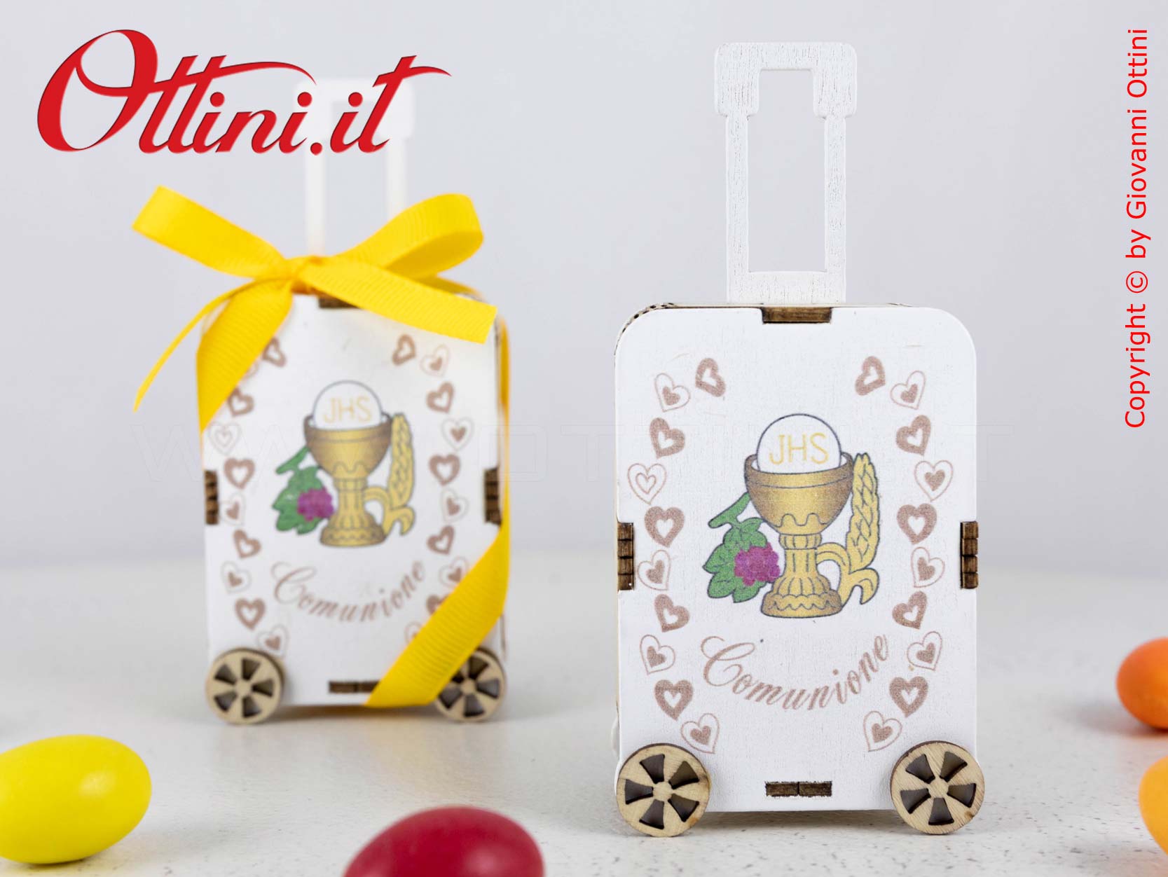 Stupenda scatolina in legno a forma di trolley con grafica per Prima Comunione.  Specifica per Prima Comunione bambino o bambina, è realizzata in legno di balsa intagliato a laser.