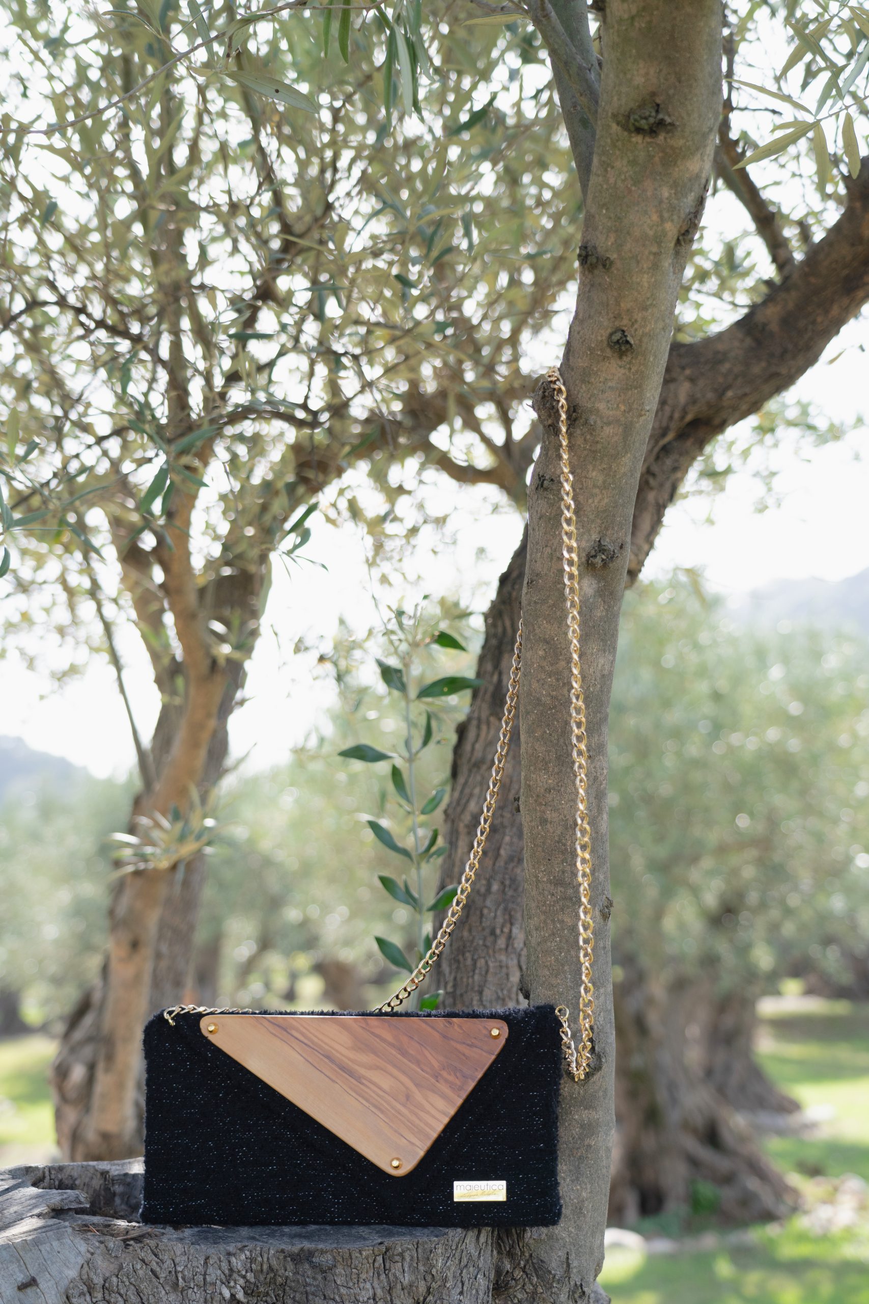 Pochette fatta interamente a mano. Possibilità di usarla con o senza tracolla; basta sganciare i moschettoni montati sulla tracolla a catena. Il legno d’ulivo agganciato da piccoli chiodini dorati impreziosisce la borsetta con le sue venature che raccontano la storia di un legno millenario straordinario.