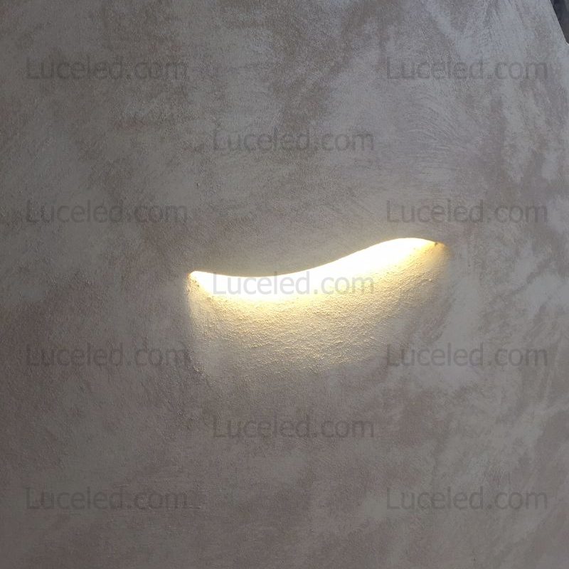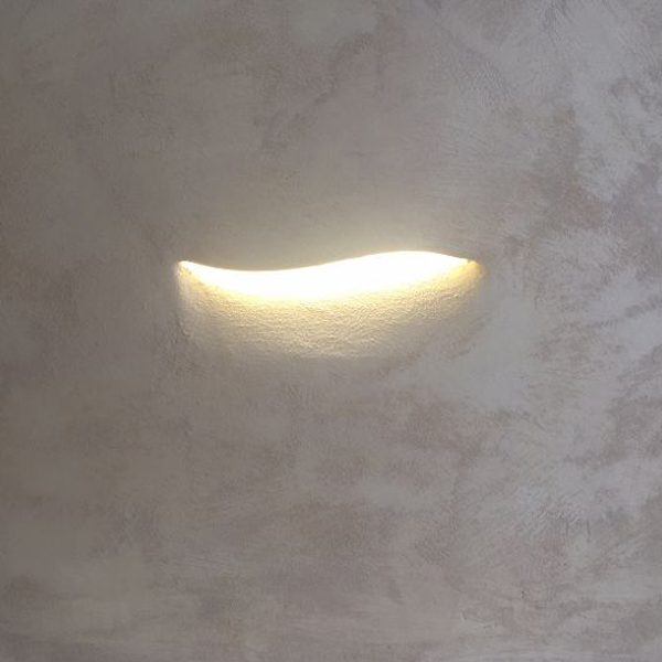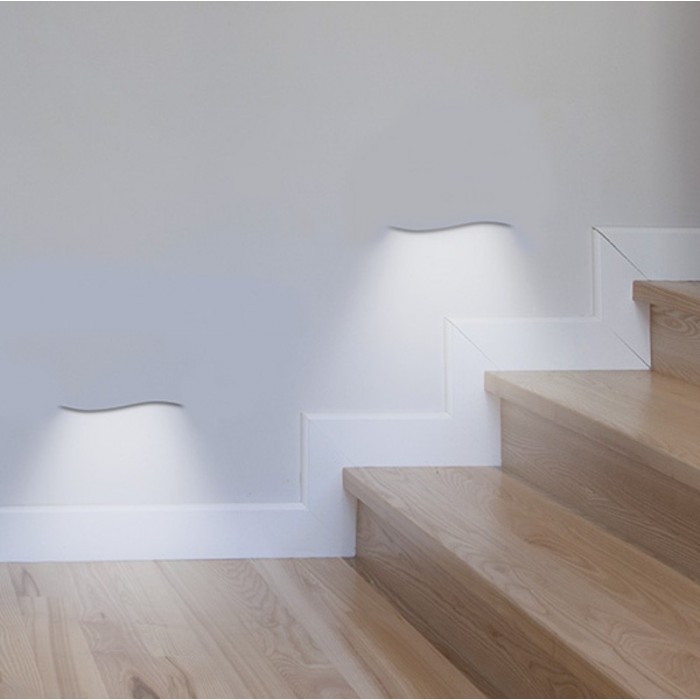 Corpo lampada in gesso, con originale forma ad onda ,per un incantevole effetto scenico che valorizza la scala e la parete. Un segnapassi minimale ed elegante che sa distinguersi. Adatto per ogni tipologia di ambiente da quello privato a quello pubblico.