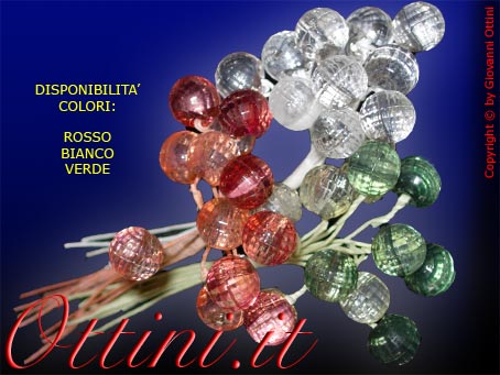 Sfere ornamentali Kristal verdi realizzate in plastica trasparente con un diametro di 9 millimetri. Mediamente in ogni mazzetto da 12 pezzi, ne troverete 6 di un colore verde più intenso e 6 trasparenti neutri. La superfice sfaccettata crea un effetto di giochi di luce che vanno dai colori più scuri ai più chiari. Andrebbero utilizzati con altri fiori artificiali e simboleggiano nella composizione, delle bacche.