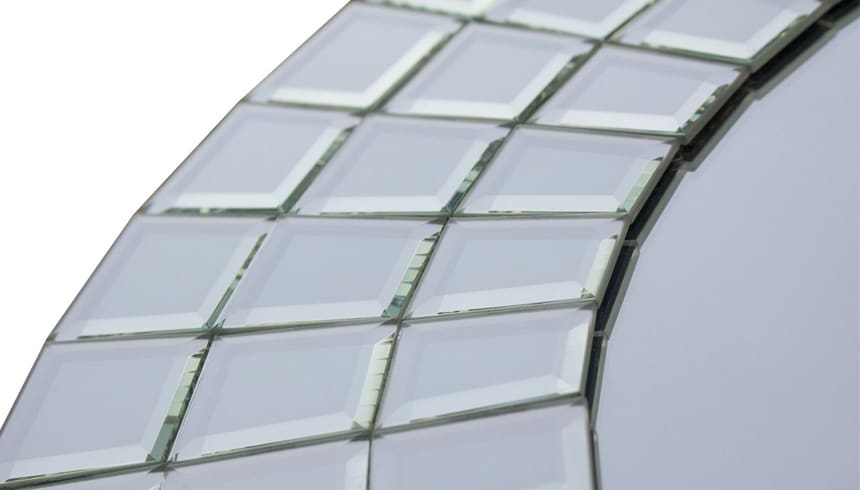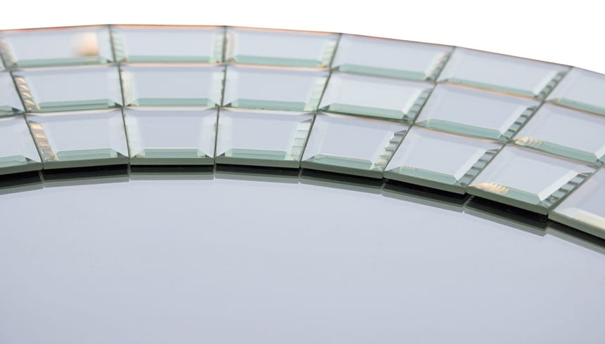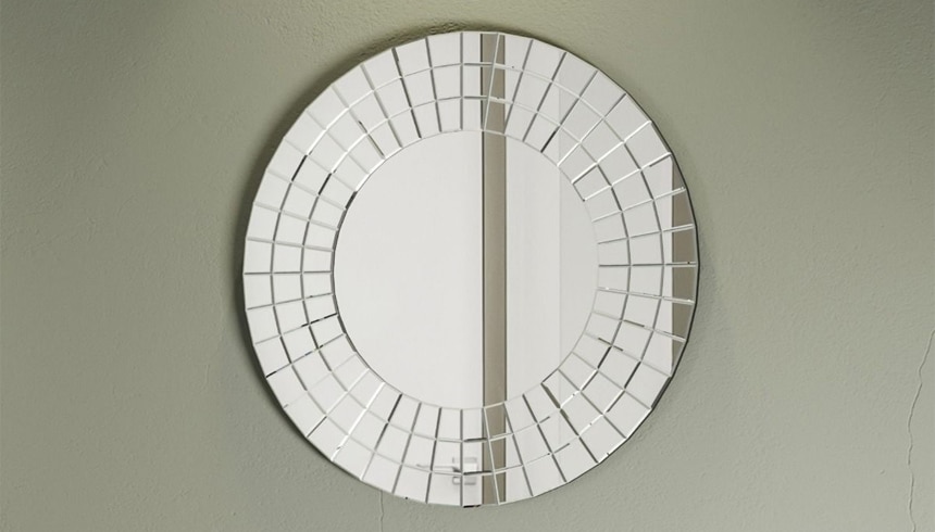 Specchio moderno di forma circolare composto da una parte centrale di diametro 38 cm e da una parte perimetrale di diametro 13 cm con trama effetto “raggi di sole”.