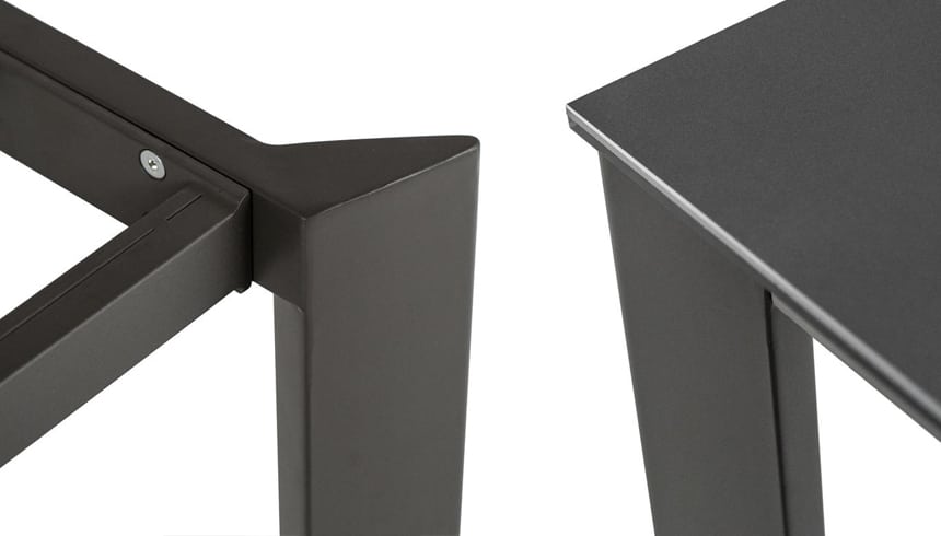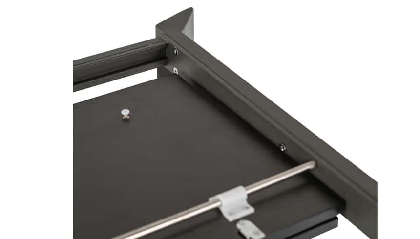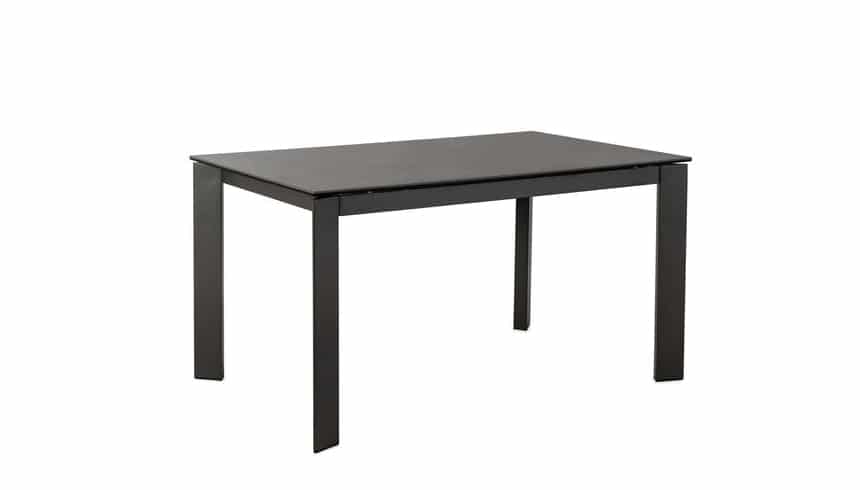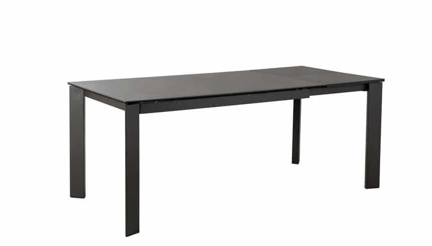 Tavolo da pranzo allungabile dallo stile moderno con gambe in metallo verniciato color grigio con top in ceramica su vetro temperato.