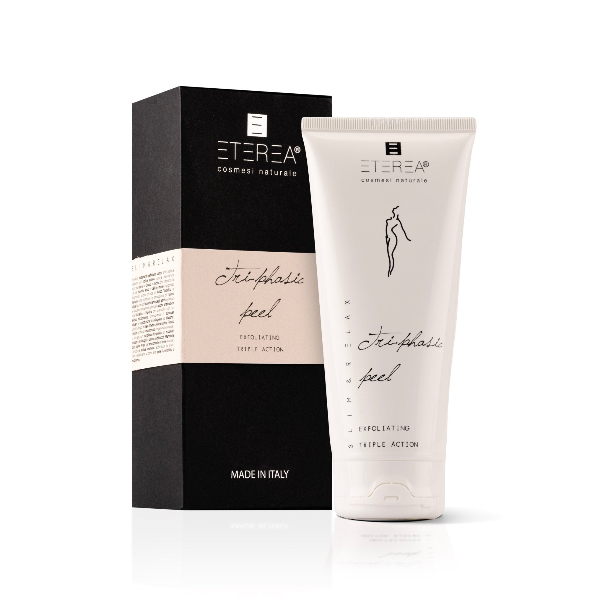 - Innovativo trattamento esfoliante corpo che agisce mediante una triplice azione: meccanica (granuli di Cocco e Jojoba) – chimica (Acido Tartarico e Acido Mandelico) – enzimatica (Bromelina e Papaina).